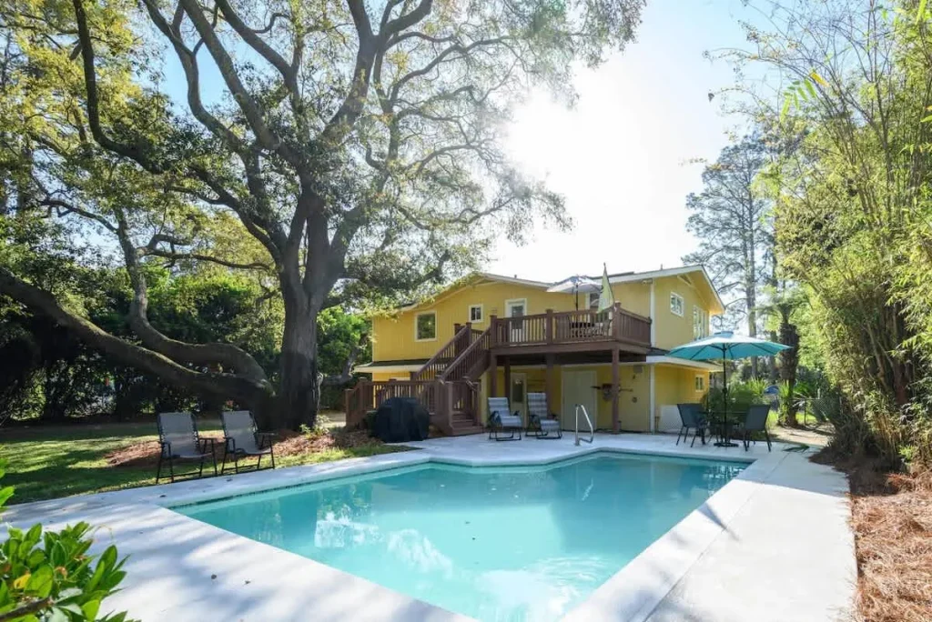 Your dream beach vacation starts here. This 5-bedroom coastal retreat offers private gated beach access just across the street. Highlights include a private backyard pool, an expansive sun deck, and three full bathrooms. The layout spans two levels, providing privacy with separate kitchenettes and lounges. Pet-friendly and located near 50 miles of island bike trails and waterfront dining.