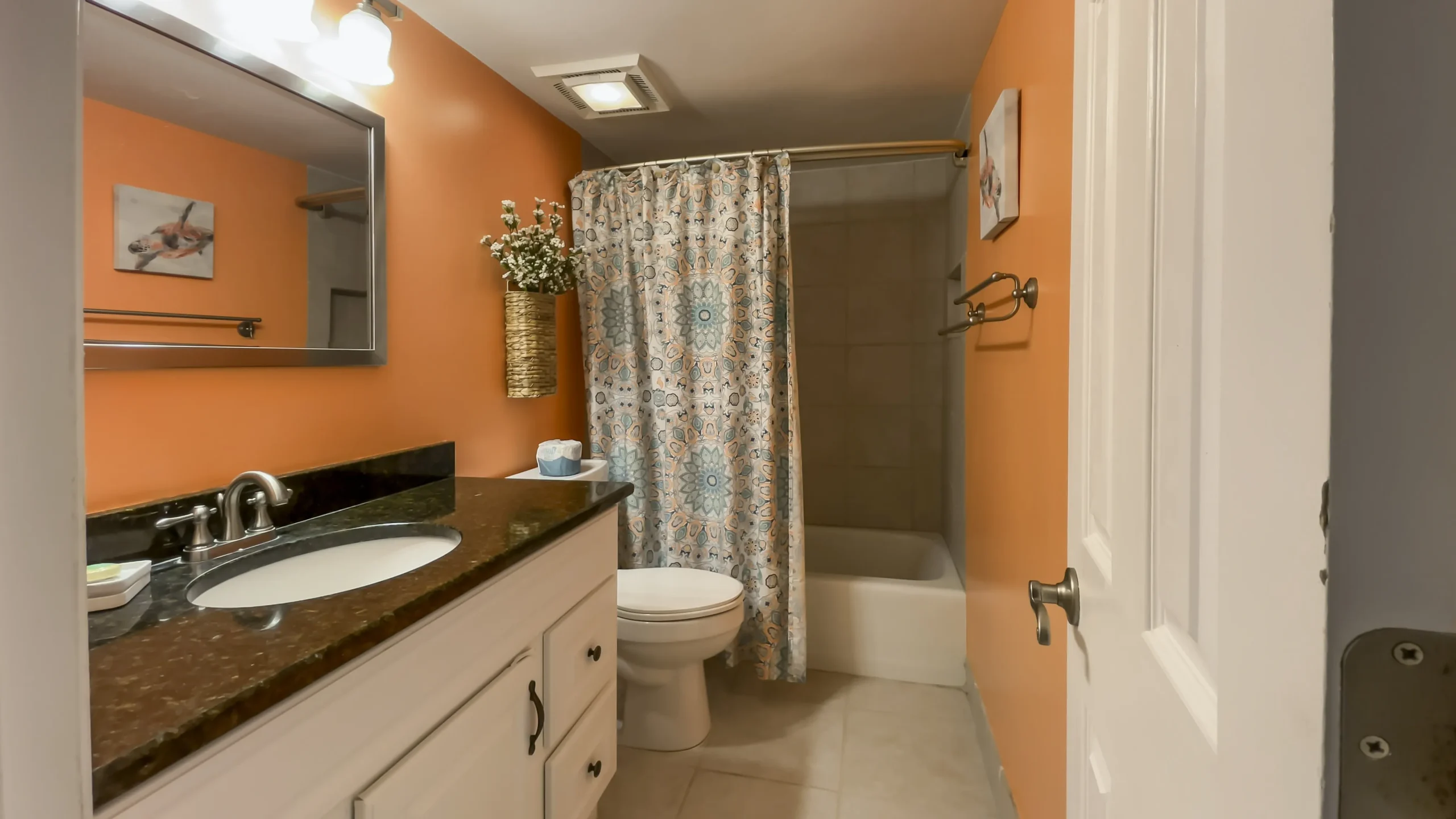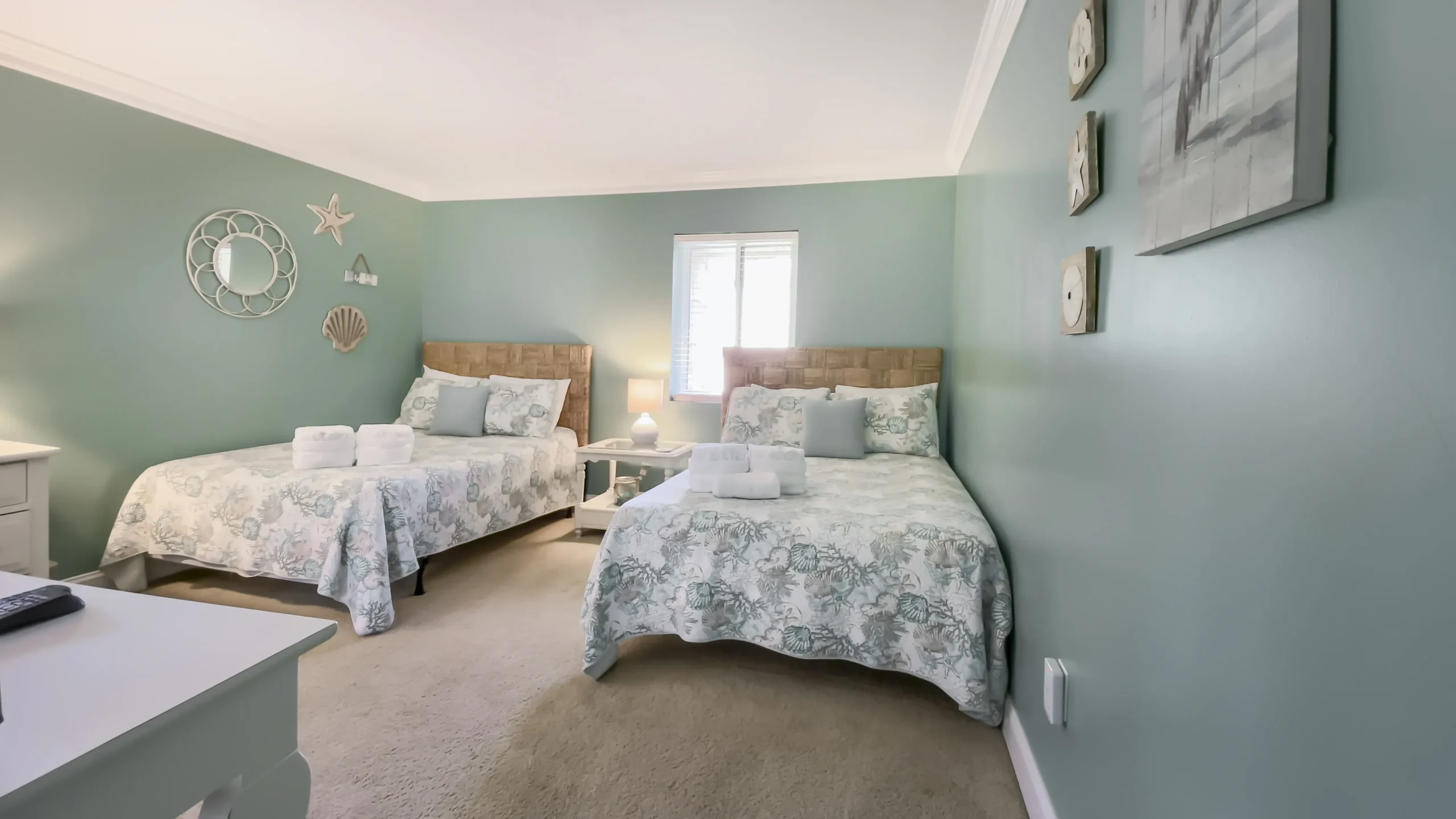 The second bedroom continues the beach motif with two double beds and an entertainment center with a flat-screen TV. The guest bathroom, complete with speckled granite and a tub/shower combination with stone tiles, carries the aquatic theme.