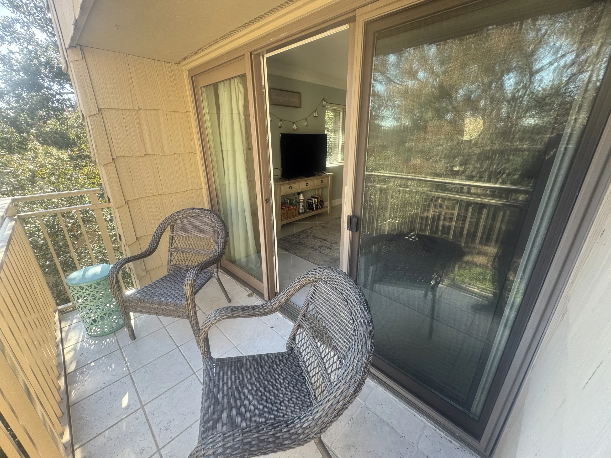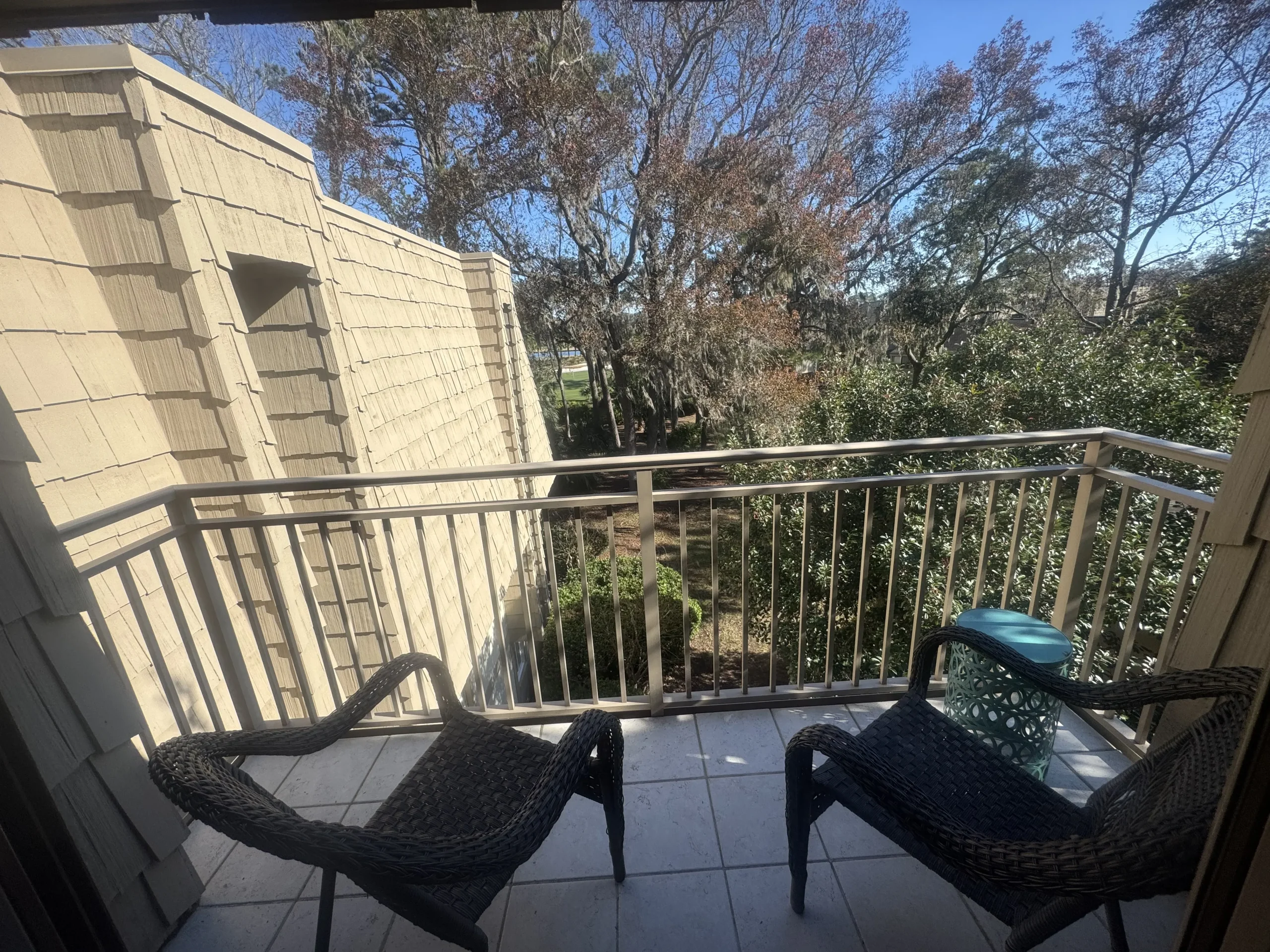 Nestled on the top floor of a newly renovated complex in the heart of Sea Pines, this bright and airy villa captures the essence of coastal living with its inviting beach-inspired decor. Elevator access ensures easy entry to the villa. The open-concept layout boasts a cozy living area with a plush sleeper sofa, two swivel chairs, and a Sharp flat-screen TV. Sliding glass doors lead to a charming patio surrounded by treetops, offering peaceful wooded and golf course views.