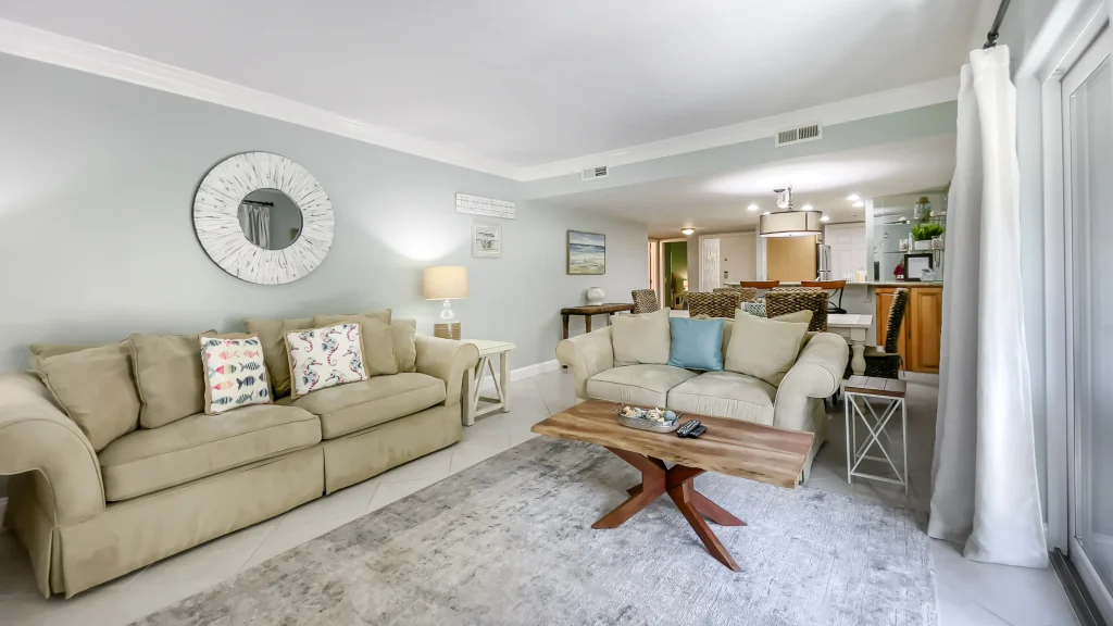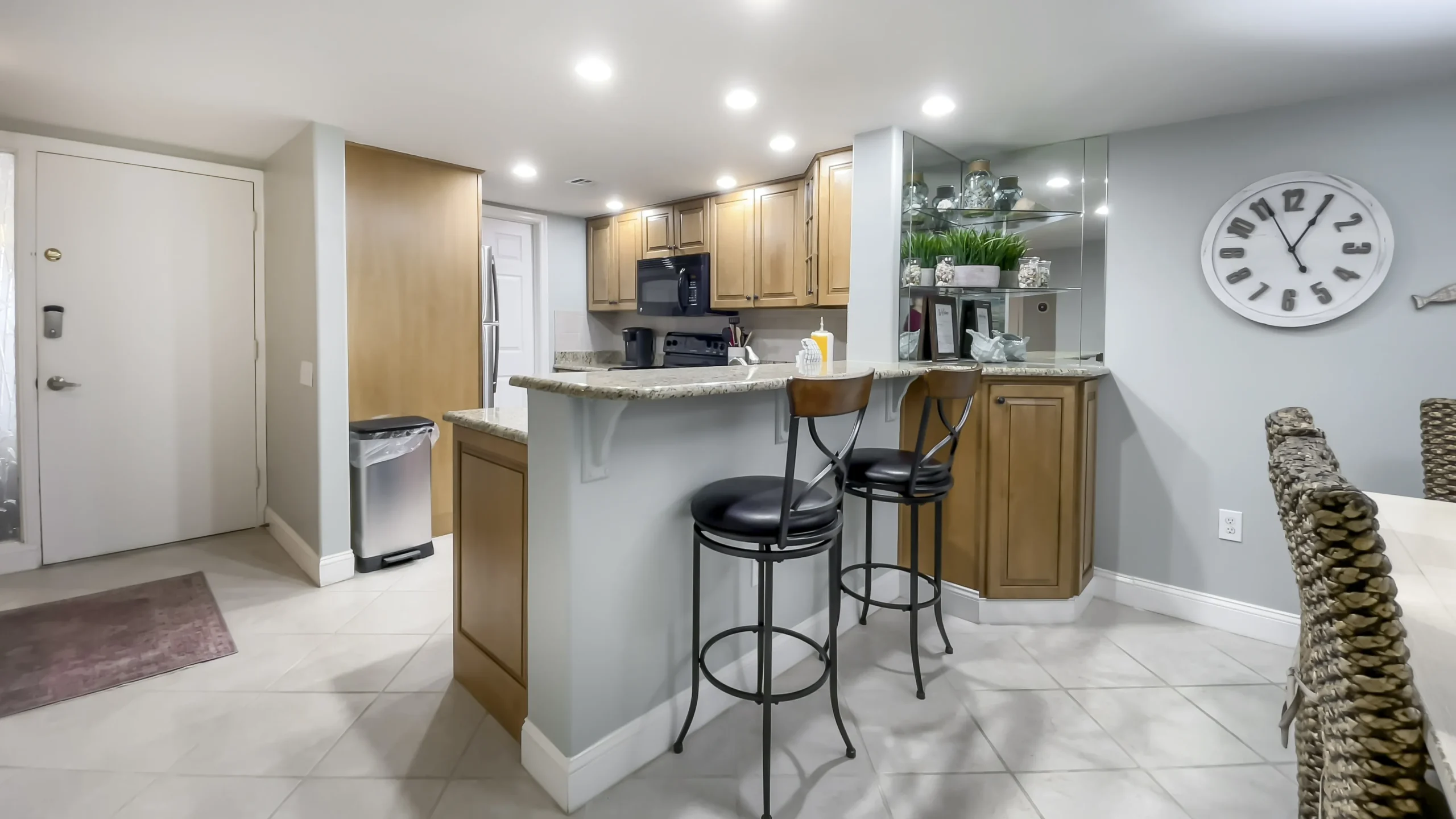 The adjacent dining area features a rustic rectangular table that seats 6-8 people, illuminated by a stylish beach-inspired light fixture. A mirrored bar with speckled granite countertops and tall counters with bar seating for two seamlessly lead into the fully updated kitchen. This space is a chef’s dream, with light taupe tile backsplash, brushed nickel cabinet pulls, and modern appliances.