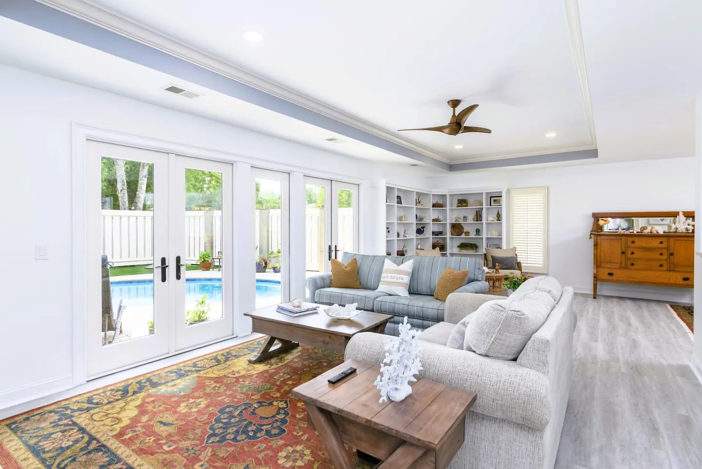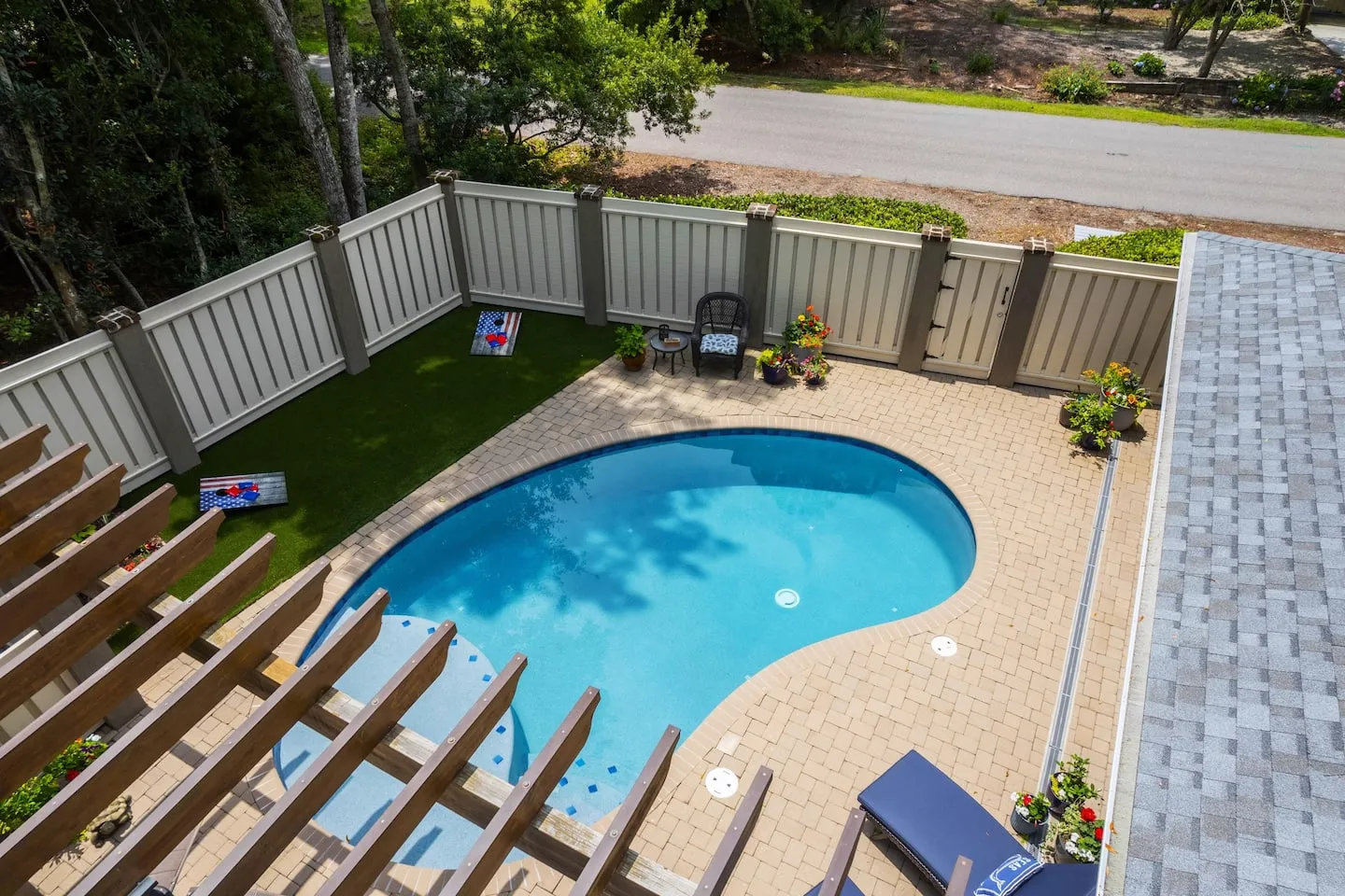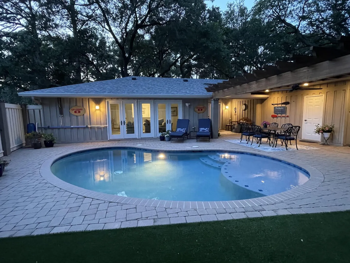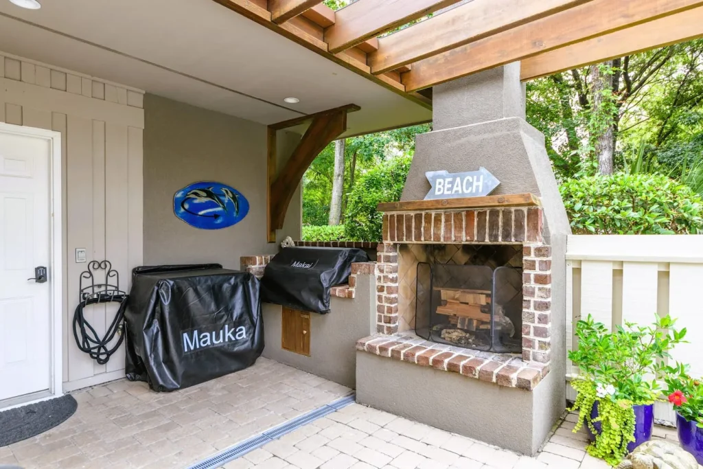 The living room is open to the backyard oasis fully fenced, private and private. It features a kidney shaped heated pool with a lounging deck, comfortable seating. an outdoor table, outdoor kitchen area with a GE profile built in grill, and a fireplace for cooler night enjoyment. There is a half bath right off of the pool area and an outdoor shower.