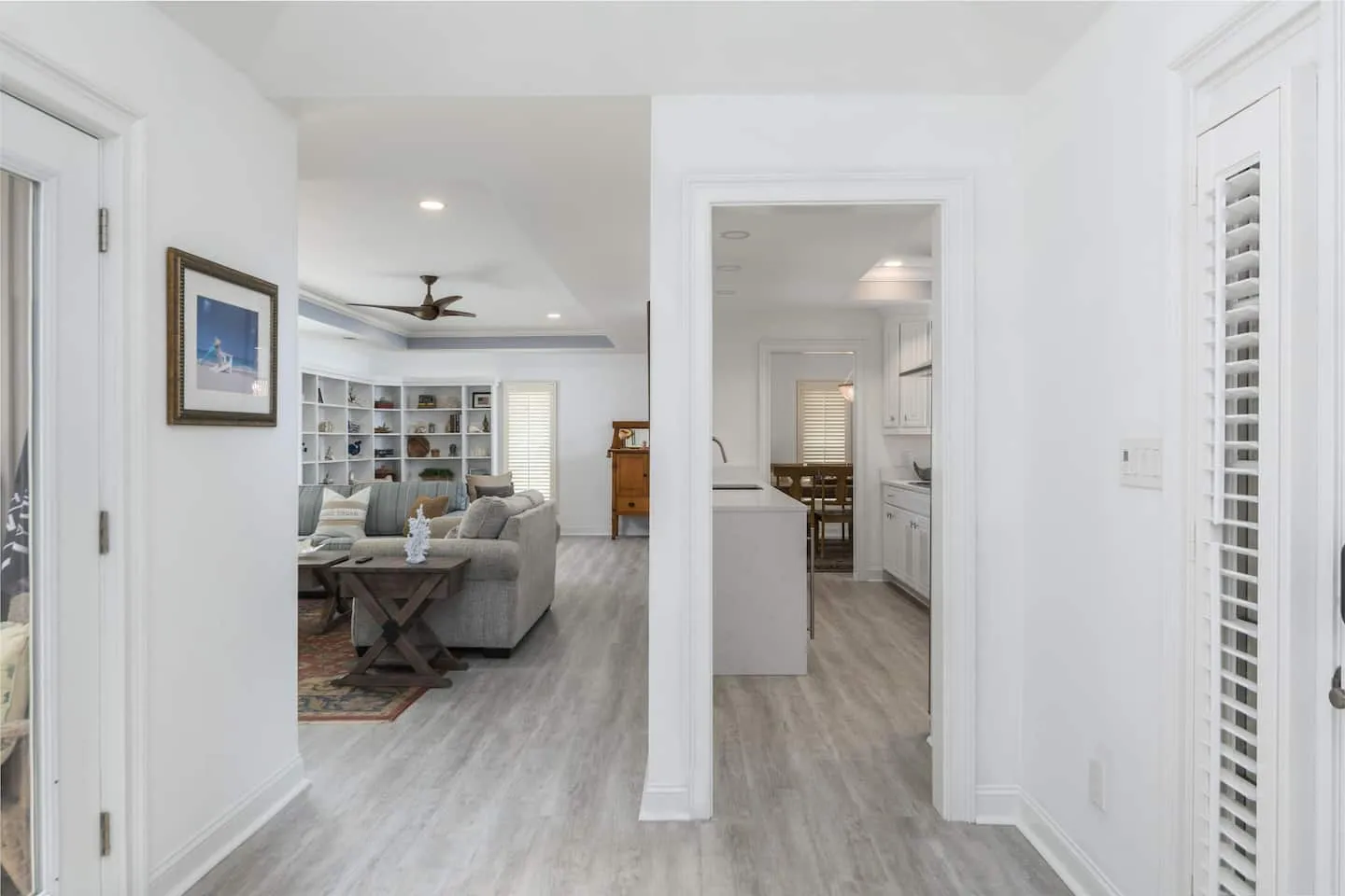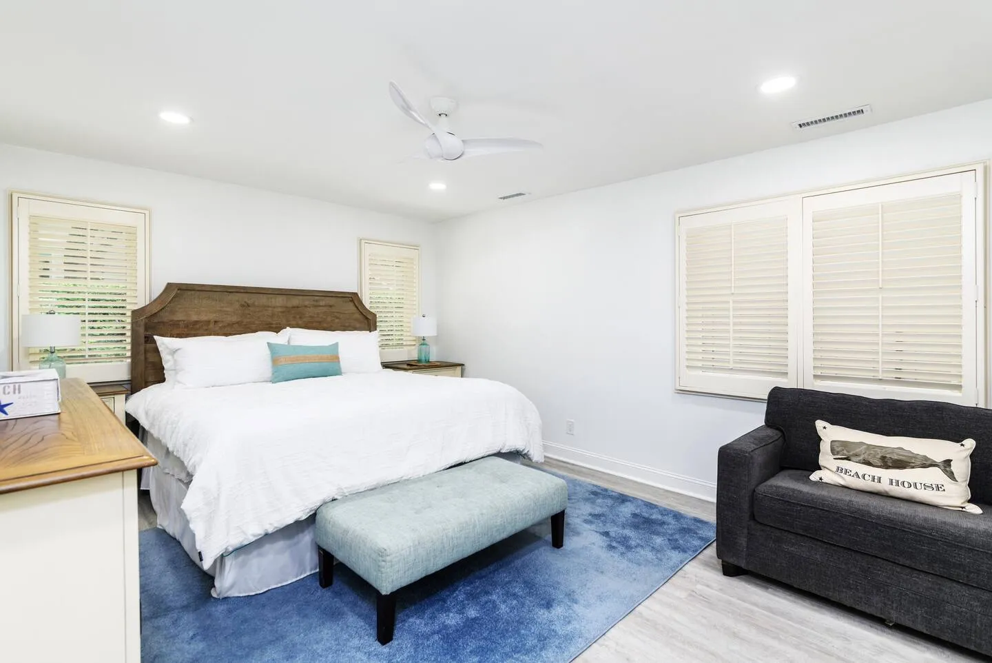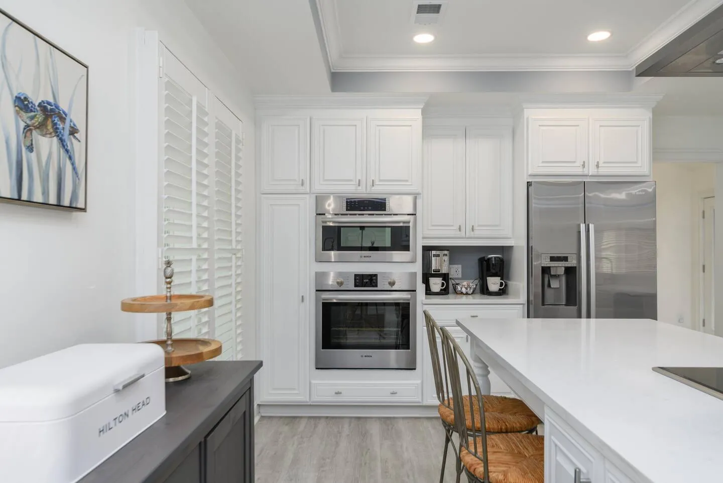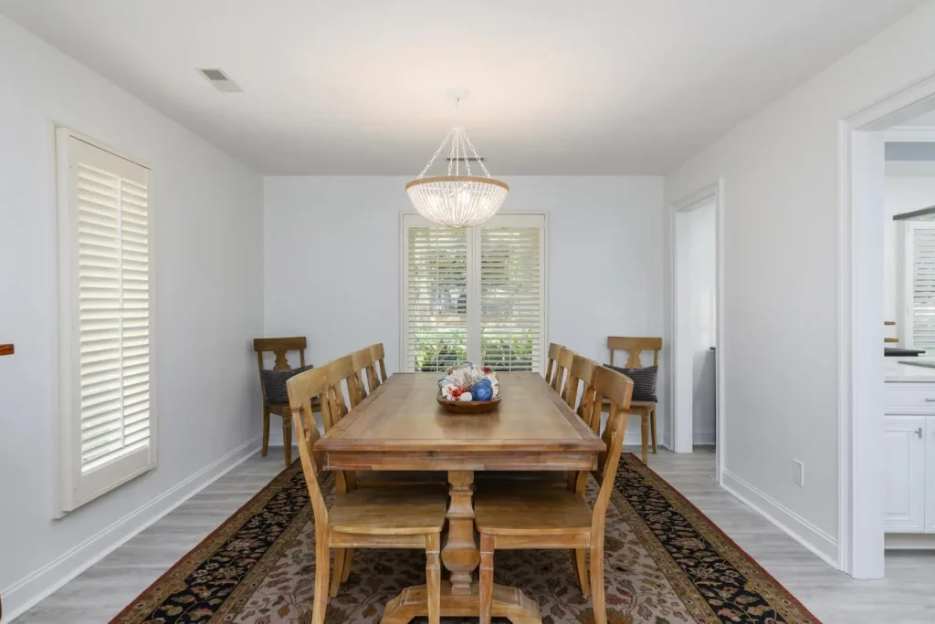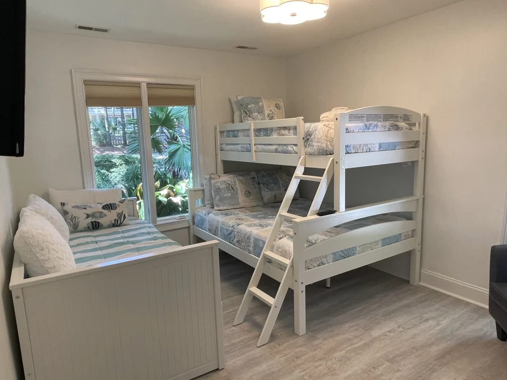 This Folly Field Beach Rental home will be the one you will want to come back to year after year! It is a 3-bedroom home that sleeps 10 with a King Bed in the main bedroom, Queen bed in the 2nd bedroom, and a bunk and day bed in the 3rd bedroom plus a pull-out sofa in the living room. This home has been redone to include a high-end upscale kitchen with state-of-the-art stainless appliances, quartz countertops, white cabinets, a stainless farm sink, and a nice sized island. Luxury Vinyl Plank coastal flooring throughout, renovated bathrooms with skylights, walk-in showers, and soaking tub. The dining room table has seating for 10 for the family to enjoy meals together. Extra large smart tv in the Livingroom with an electric fireplace under it. All bedrooms have wall mounted smart tvs.