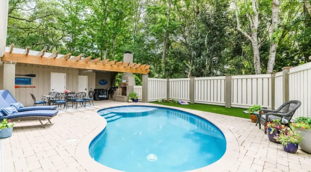Discover a private oasis just 2 blocks from Folly Field Beach Park. This upscale home features a designer kitchen with a stainless steel farm sink and quartz islands, luxury bathrooms with skylights, and a private pool area with an outdoor shower. Perfect for year-round visits, enjoy the outdoor fireplace in the winter or the lounging deck in the summer. Close to the Heavenly Spa and Port Royal golfing.