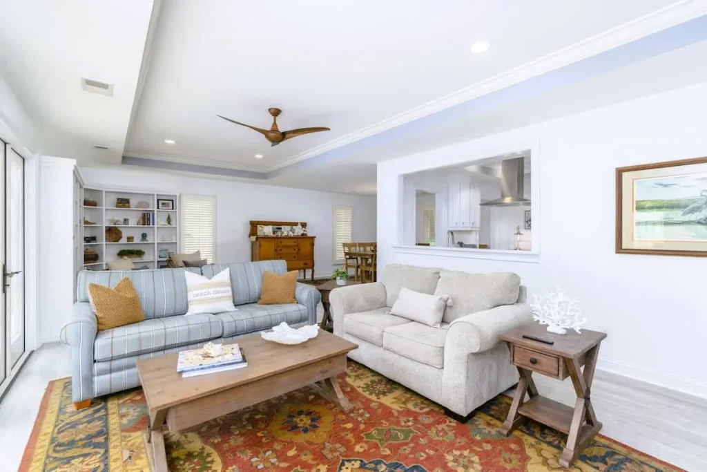 Welcome to your private coastal sanctuary at 54 Folly Field Road. This meticulously renovated 3-bedroom, 2.5-bathroom home offers a sophisticated blend of modern luxury and relaxed beach living. The heart of the home is a state-of-the-art kitchen, featuring quartz countertops, professional-grade stainless steel appliances, and a farmhouse sink, all centered around a spacious island perfect for morning coffee.
