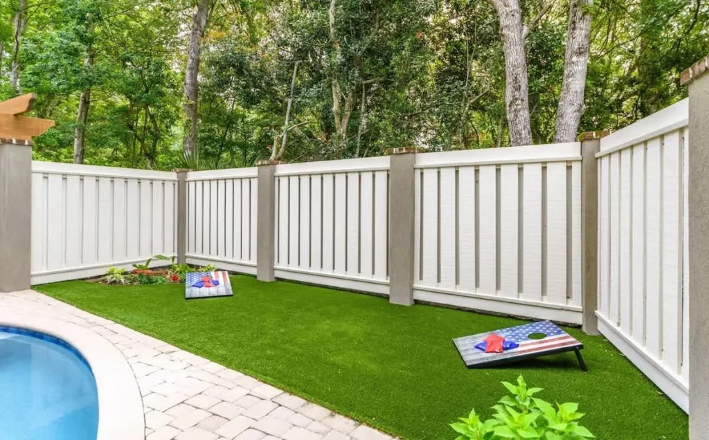 The open-concept living area features luxury coastal flooring and an extra-large smart TV mounted over an elegant electric fireplace. Floor-to-ceiling glass doors lead you to the crown jewel of the property: a fully fenced, private backyard oasis. Here, you can enjoy a kidney-shaped heated pool with a dedicated lounging deck, a professional outdoor kitchen with a built-in GE Profile grill, and a secondary fireplace for evening relaxation.