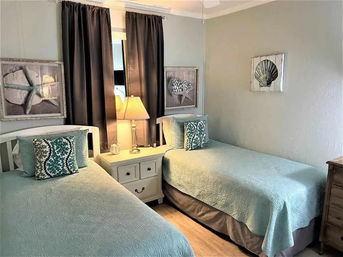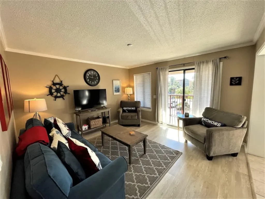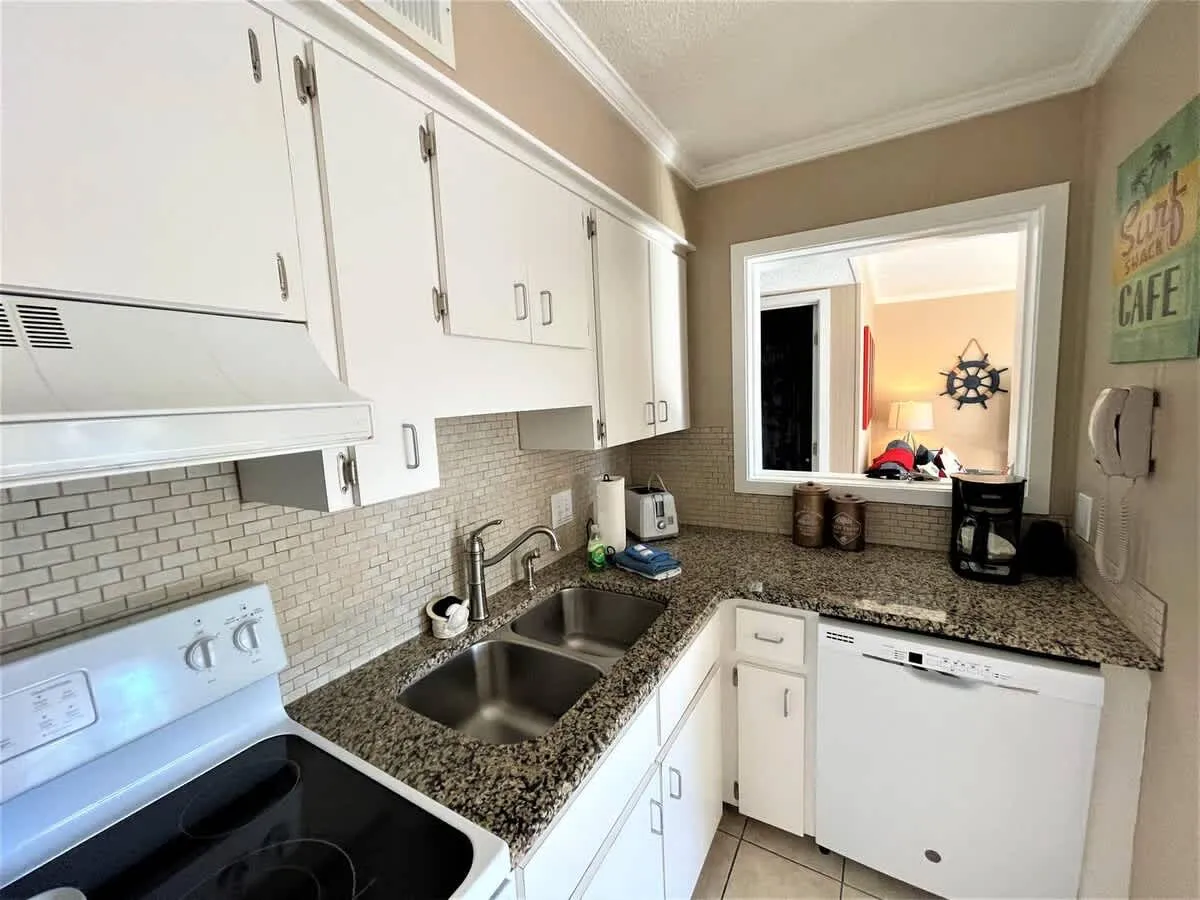 Our 2nd-floor villa at Admiral’s Row combines the convenience of a premier resort with the privacy of a personal beach home. The interior features a “white and bright” aesthetic, highlighted by granite countertops in a fully equipped kitchen and durable tiled flooring throughout—perfect for easy cleanup after a day at the beach.