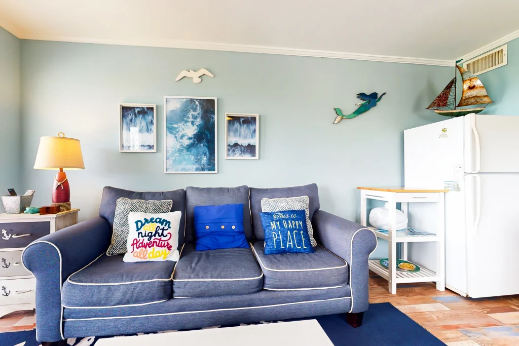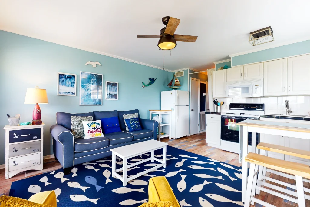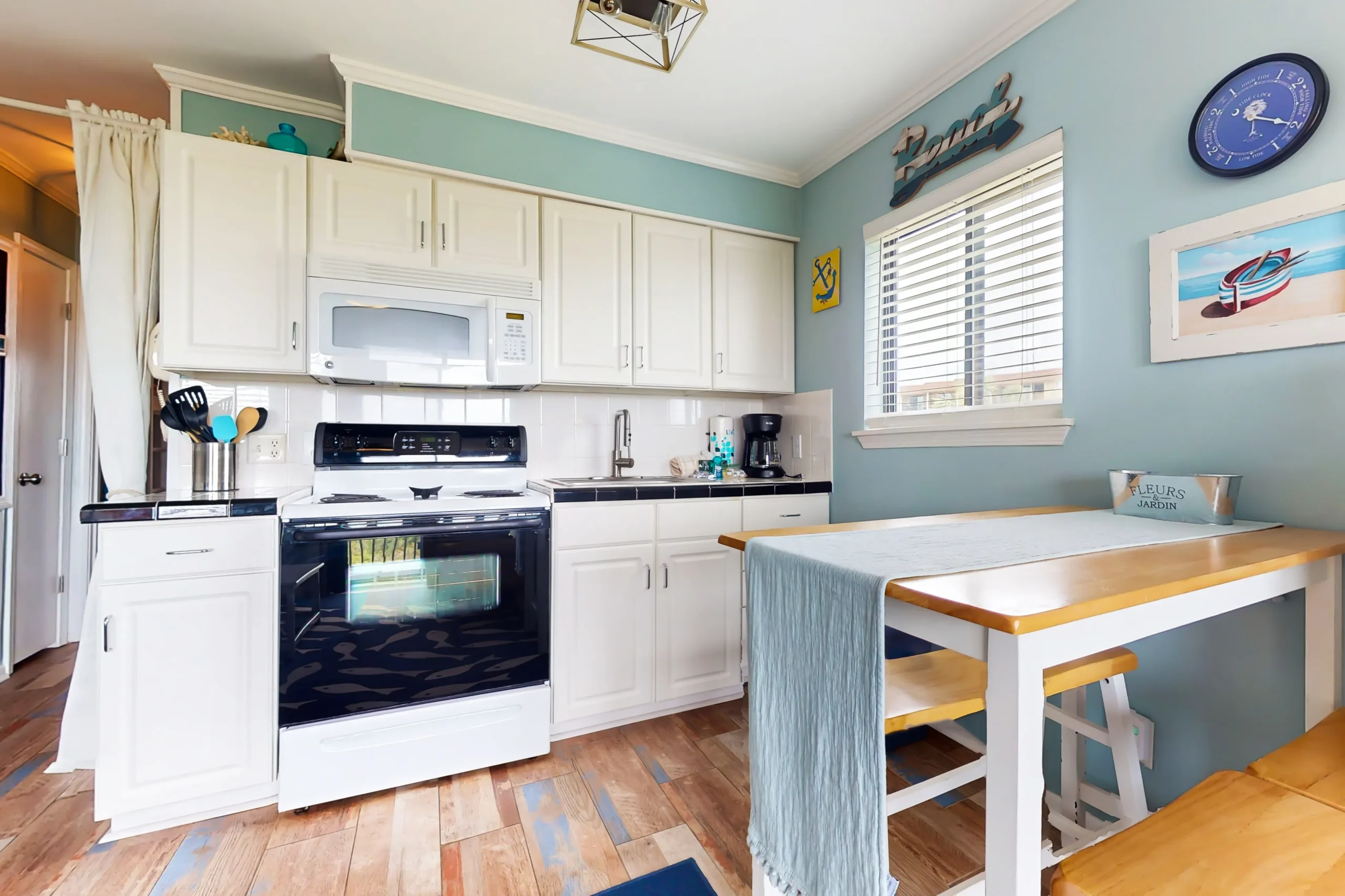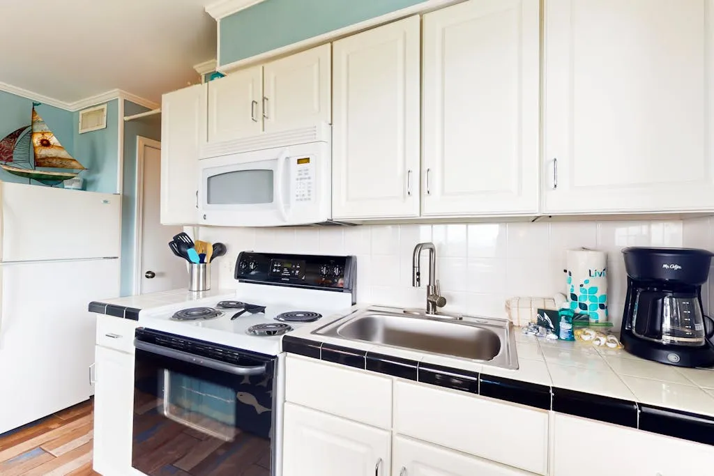 Inside the condo, you’ll find a comfortable living space with a sofa bed, central air-conditioning, and WiFi. The balcony offers a peaceful spot to enjoy your morning coffee and watch the sunrise over the water. The well-equipped kitchen features modern appliances, including a fridge, stove, oven, microwave, and coffee maker, making meal preparation a breeze.