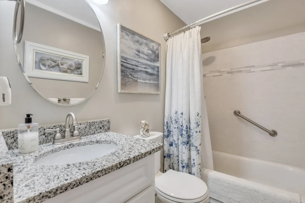 This stunning Admiral Row Beachfront villa offers everything you need to make vacation memories. You will want to return to the vacation villa every year for your beach vacation. This is a first-floor unit with awesome ocean views and has been totally remodeled throughout. Nothing was left untouched. It has an open floor plan with granite counters, stainless steel appliances, Luxury Plank flooring throughout, smooth ceilings, and renovated baths with tiled surround bathtubs. The main bedroom features a King-sized bed and private bath. The 2nd bedroom has 2 Twin beds, and there is a pullout sofa in the living room to comfortable accommodate 6 guests.
