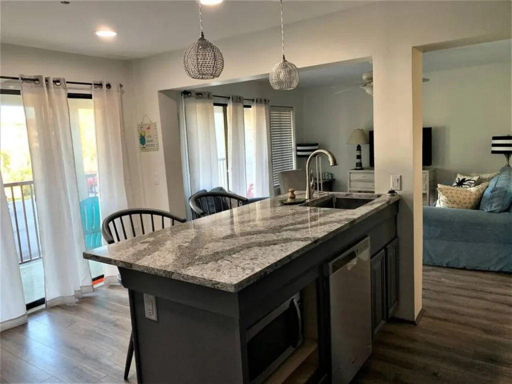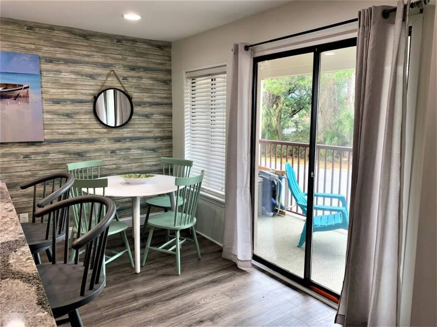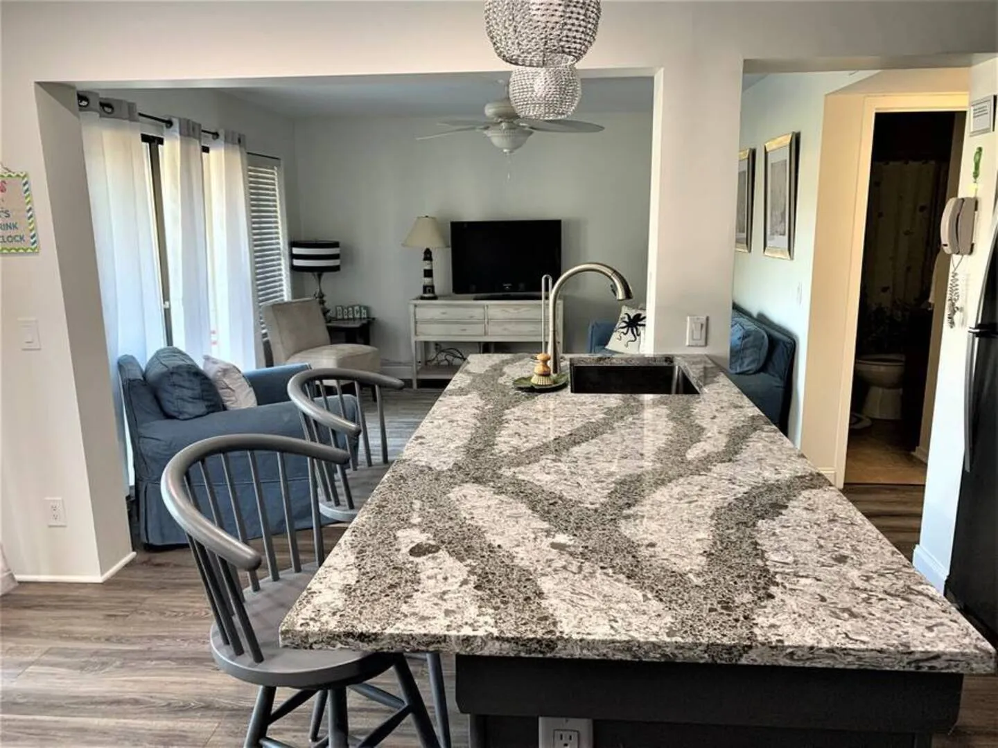 Luxury 2 Bedroom 2 Bath Villa just steps from the Beach with double sized deck for outside seating located in one of the best Ocean Front Resorts on Hilton Head with direct beach access and slight ocean view from balcony. Remodeled with luxury planked grey flooring, granite countertops, new designer grey cabinets, and oversized kitchen island with seating and brand new stainless steel appliances. Open floor plan with kitchen view to living room. Remodeled baths and a walk-in shower in the master.