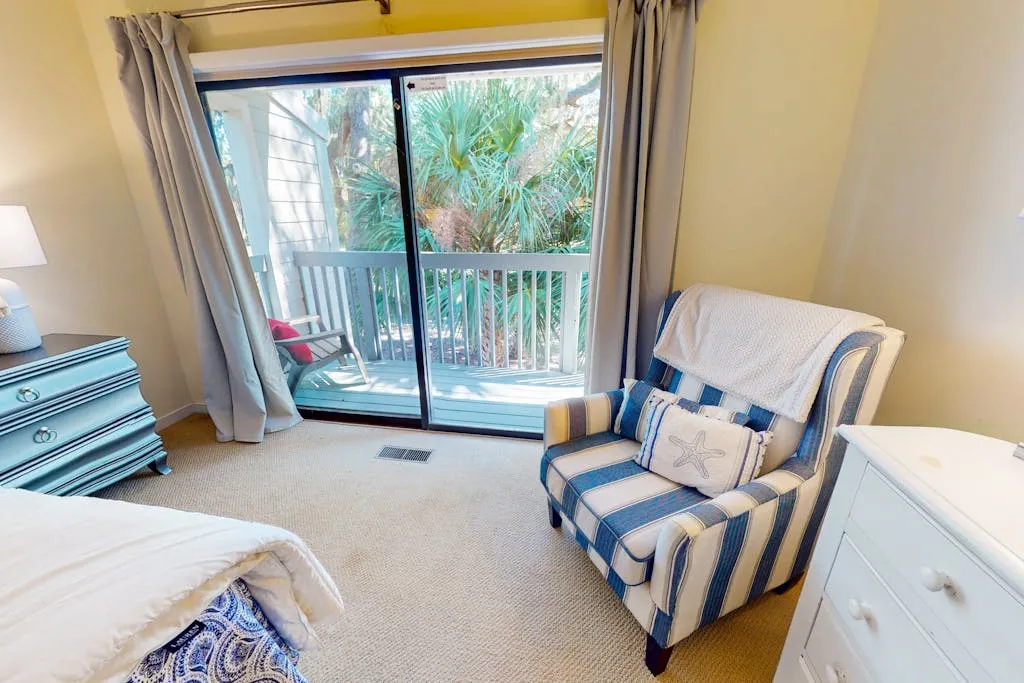 This home features two inviting bedrooms: a master suite with a king bed and a private bath, and a second bedroom that also includes a king bed and its own full bath. There’s even a cozy bonus room with an additional twin bed (perfect for child or an extra guest), and a queen sized pull out bed in the living room for even more sleeping space if needed! This home has everything you will need for an unforgettable vacation, including a huge back patio with a beautiful view of the golf course, plenty of outdoor seating, a grill, and a fire pit table! There is a balcony deck off the two bedrooms that offers the same great view of the golf course with more privacy! There is also a desk if you need to work, a dining room table that comfortably seats six, a fully-stocked kitchen, a coffee bar area, brand new living room furnishings, as well as a fenced in front patio area perfect for dining or reading. You can relax and unwind in this peaceful and spacious two-story sanctuary just a short distance from some of the best shopping and dining Hilton Head has to offer!