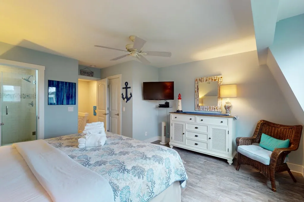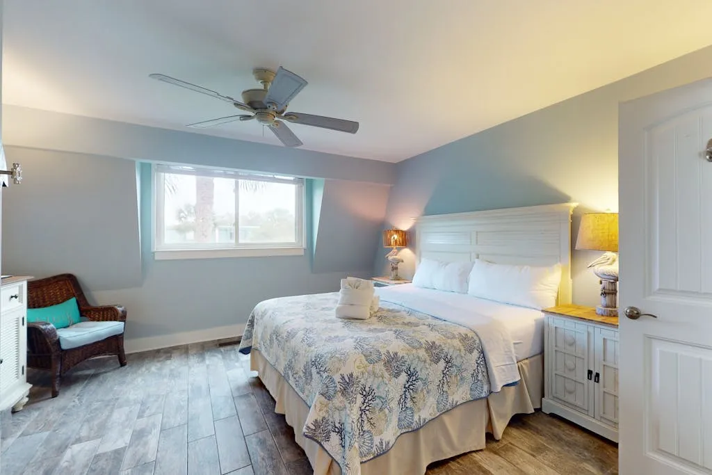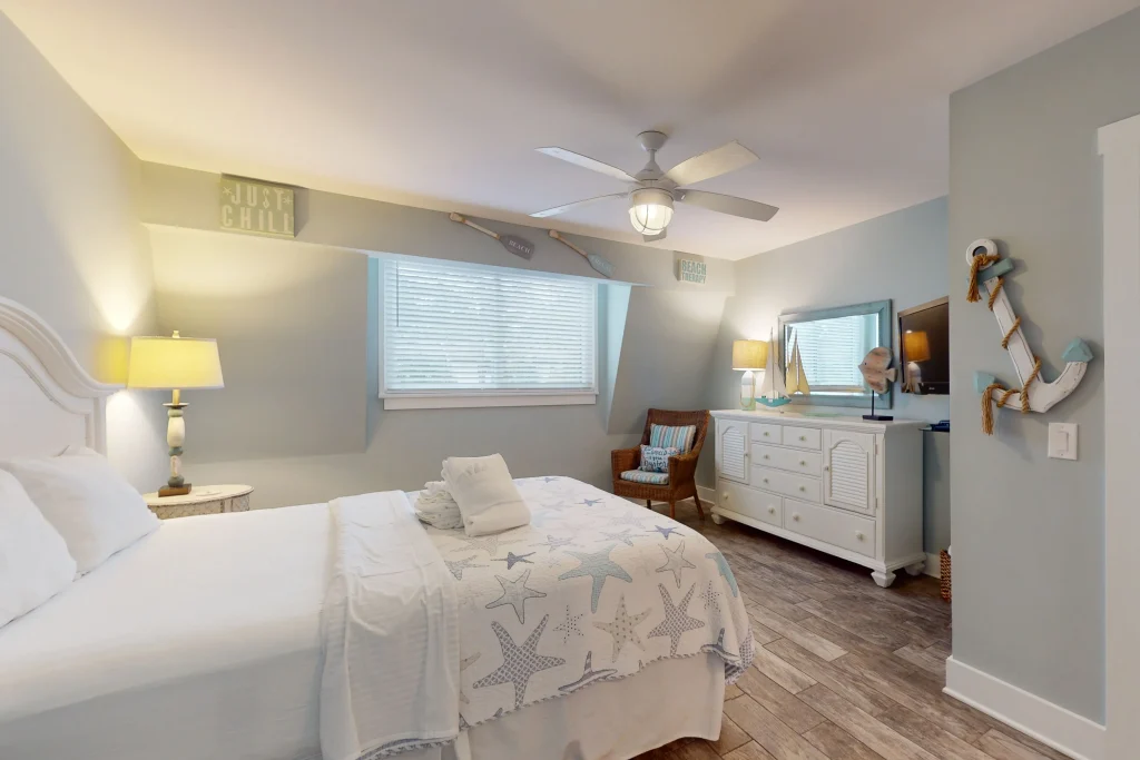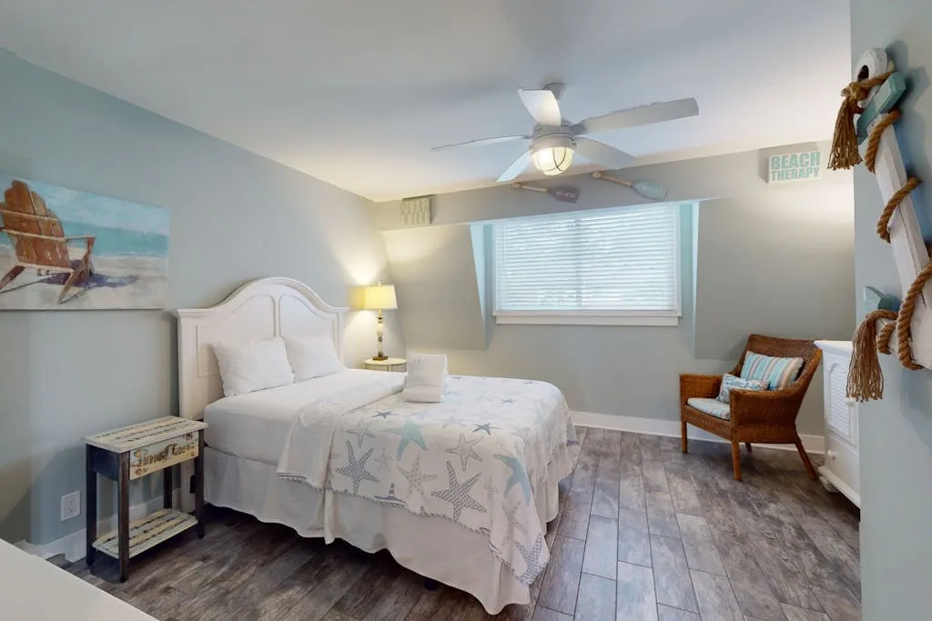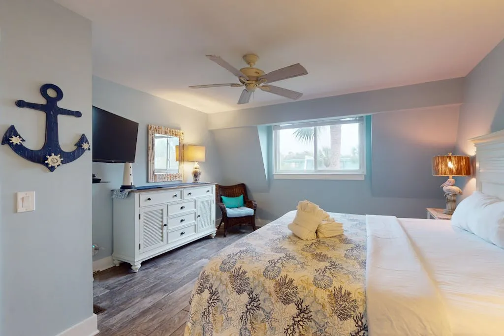 Upstairs, both bedrooms offer en-suite bathrooms and flat-screen TVs. The master bedroom boasts a king-size bed, while the guest bedroom features a queen-size bed. Surf Court Villas is a charming ocean-oriented complex with lush landscaping, just a short walk from the beach and vibrant Coligny Plaza.