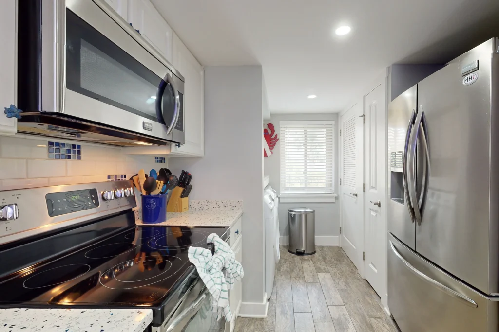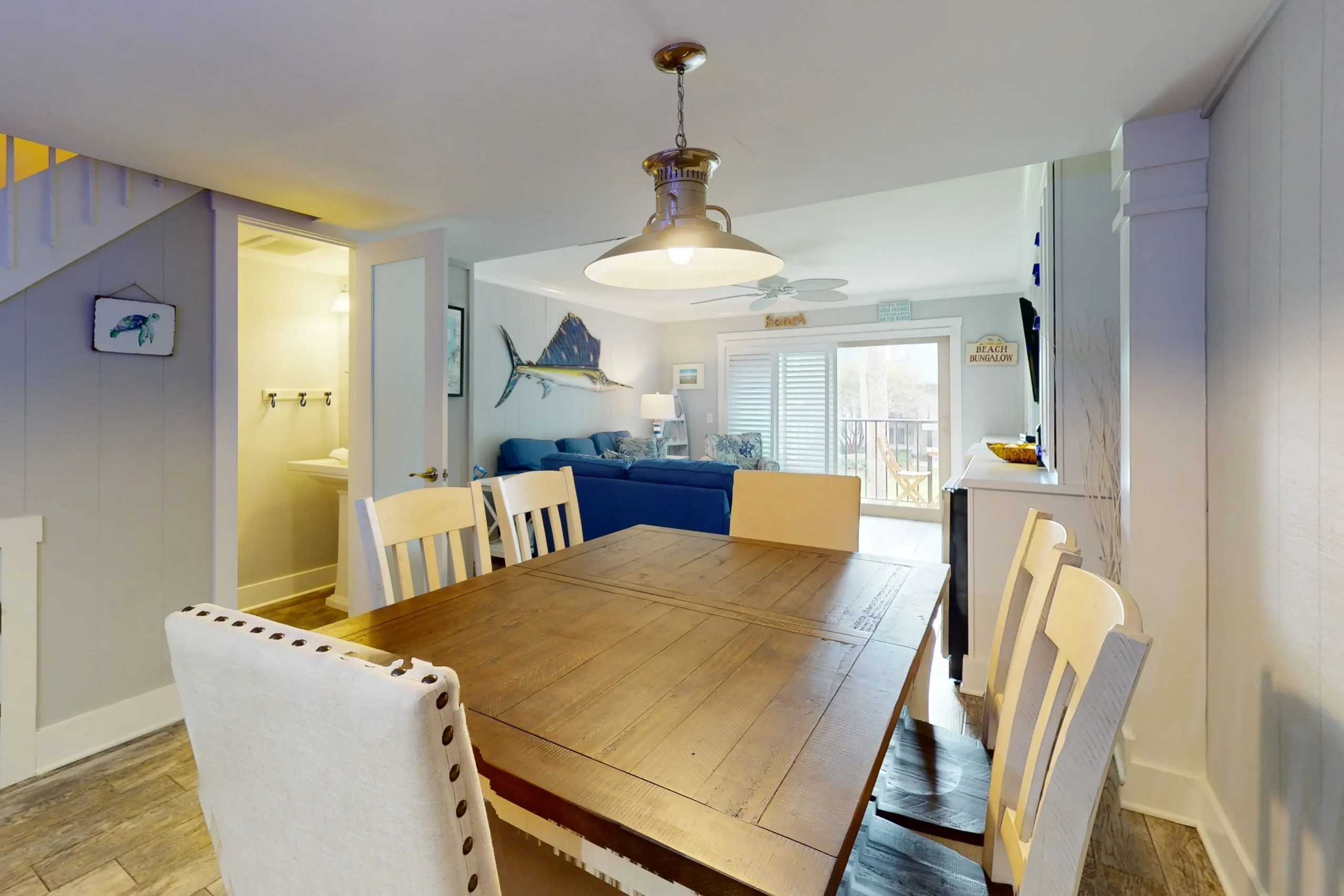 Experience modern comfort and convenience at this updated two-bedroom, two-and-a-half-bath beach condo in Hilton Head, SC. The main level features stylish furnishings and a fully equipped kitchen with stainless steel appliances, sleek cabinets, granite countertops, and a generous breakfast bar. Step out onto the deck overlooking beautifully landscaped grounds and a pool, or relax in the spacious living room. A half bath off the dining area adds convenience, and the dining room comfortably seats four, with additional seating at the breakfast bar.