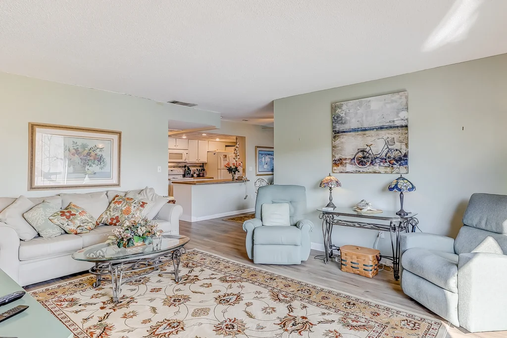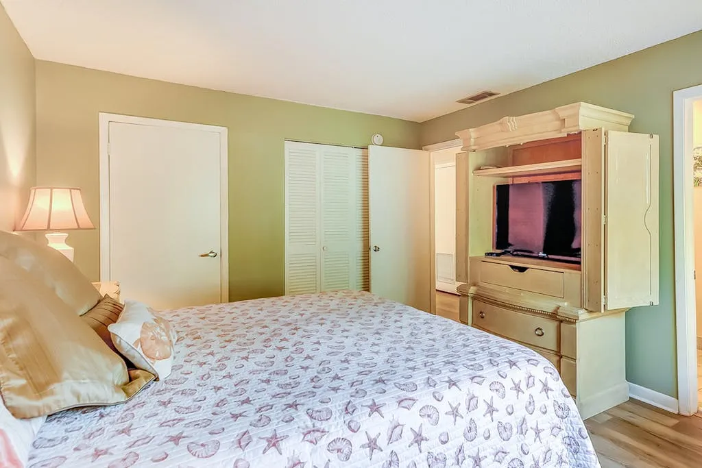 This one-bedroom, one-and-a-half bathroom condo villa at Island Club sleeps four people and is conveniently located at the end of the building, offering a private patio. The condo gives you access to shared pools and a shared hot tub, as well as a zero-entry children’s pool, playground, tanning shelves, fitness center, and sports courts.