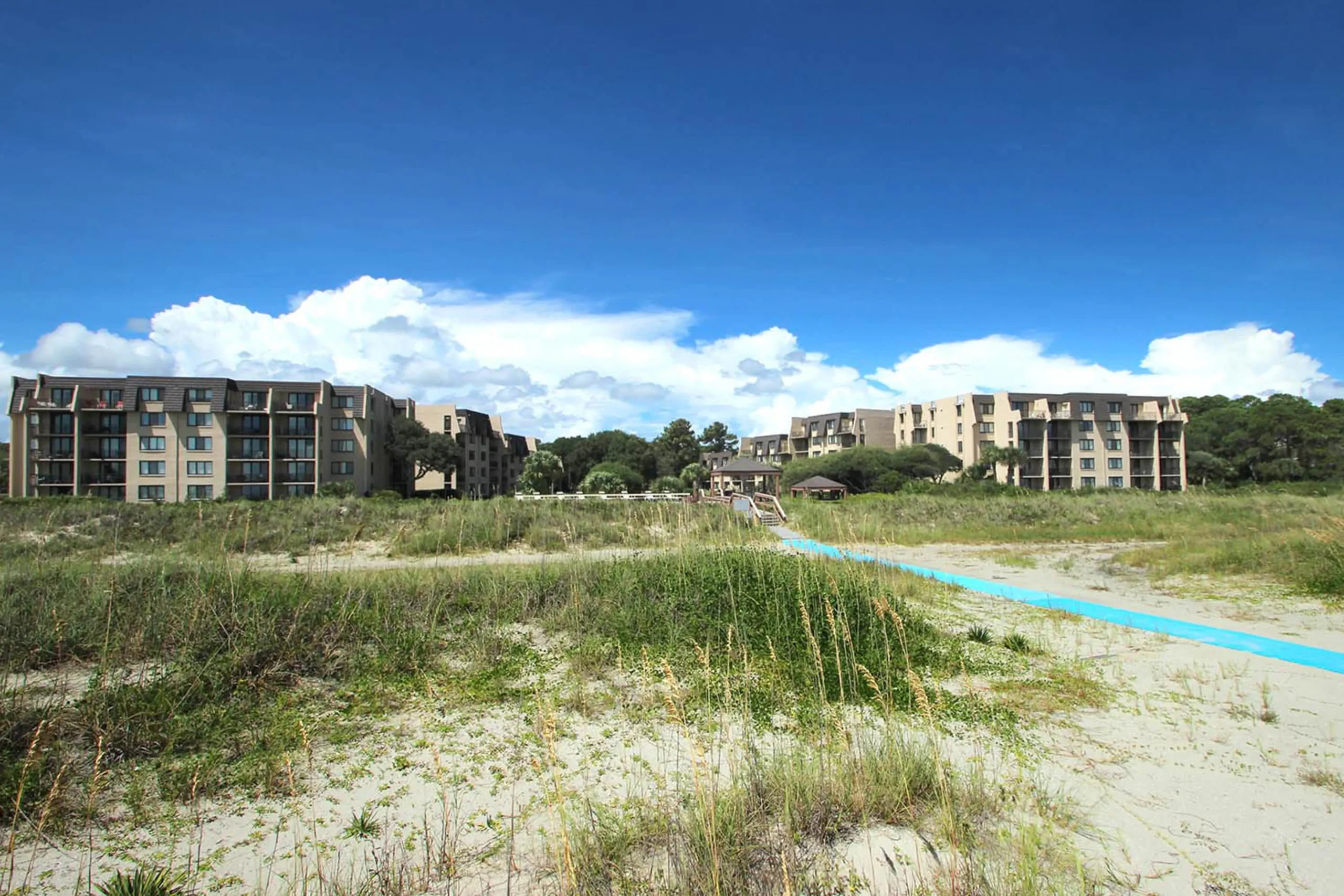 This Island Club villa complex is located in the Folly Field area of Hilton Head Island. Walkways lead guests directly to the beach from this oceanfront property, and picnic areas with barbecues offer great places to hang out.