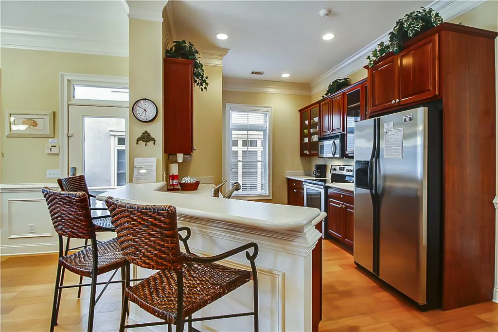 Spread across two floors, the sun-drenched interior boasts presents room for socializing and quiet time alike. Prepare home-cooked meals in the sparkling full kitchen, configured with stainless steel appliances and ample counter space. Two covered balconies ensure extra room to enjoy coastal breezes.