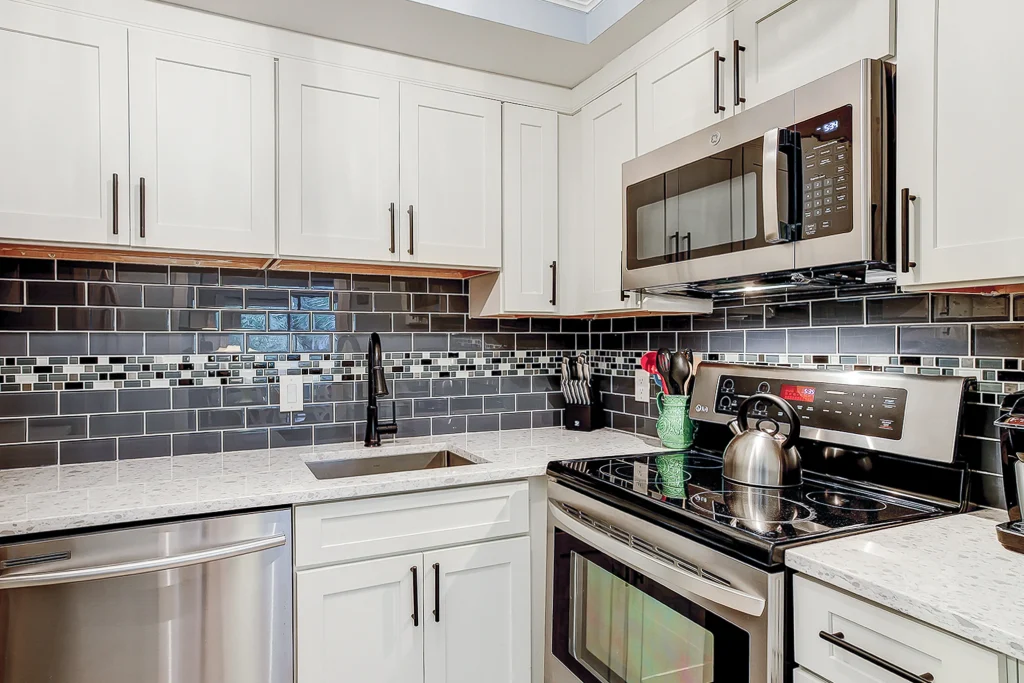 The fully-equipped and awesomely updated kitchen has everything needed for preparing daily meals. The custom cabinets, decorative backsplash, stone counters, and stainless appliances offer just the right touch to complete this smashing update. The dining area is just off the kitchen and has a table and six chairs.
