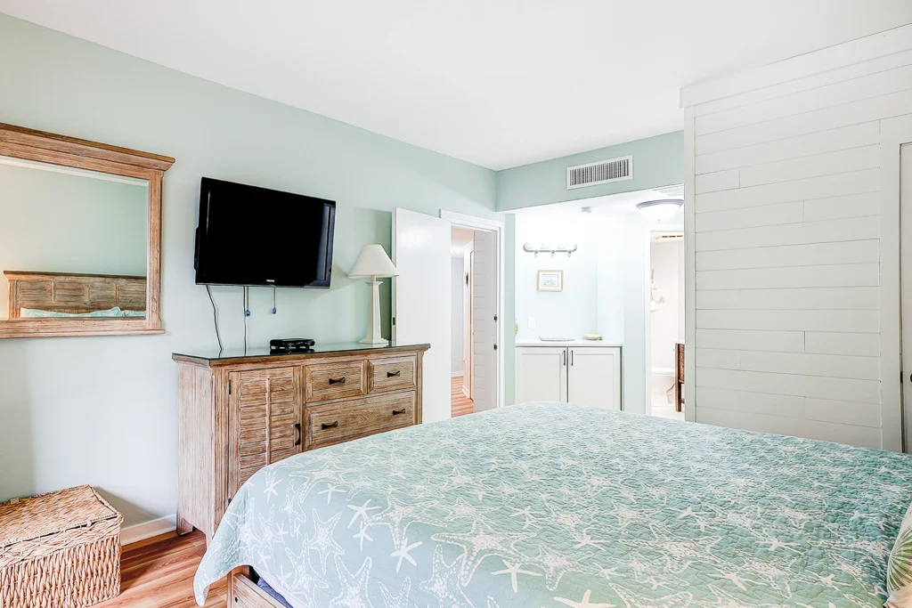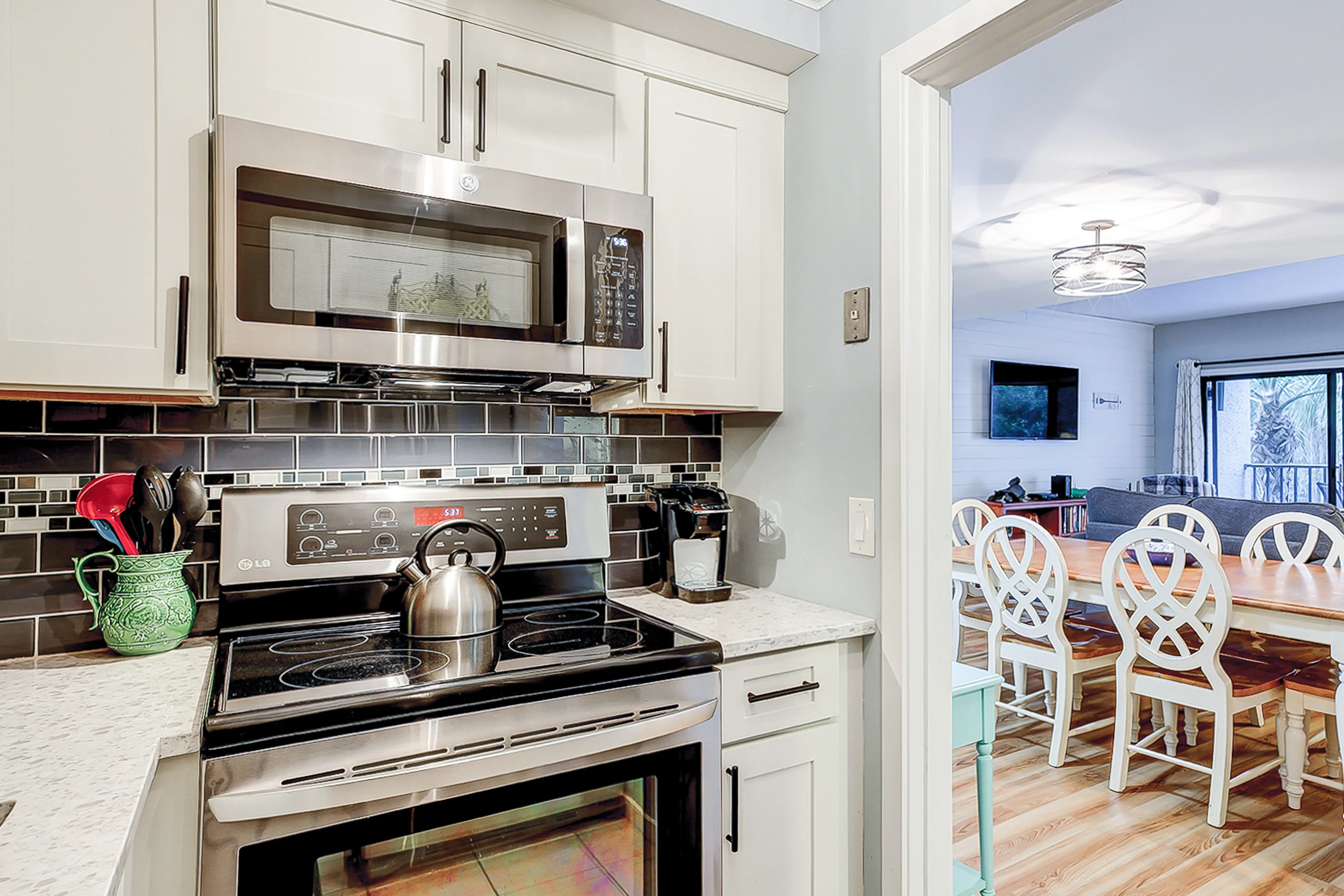 Enter the building through the lobby and take the elevator to the first level. The keyless entry system on the front door of the condo makes direct check-in and check-out a breeze. You are greeted with the beautiful luxury vinyl plank flooring, tasteful décor, many updates, comfortable furnishings, and flatscreen TVs in every room! The living room has a sleeper sofa and loveseat, a large, wall-mounted flat panel TV, and balcony access for enjoying the serene sounds of the village.