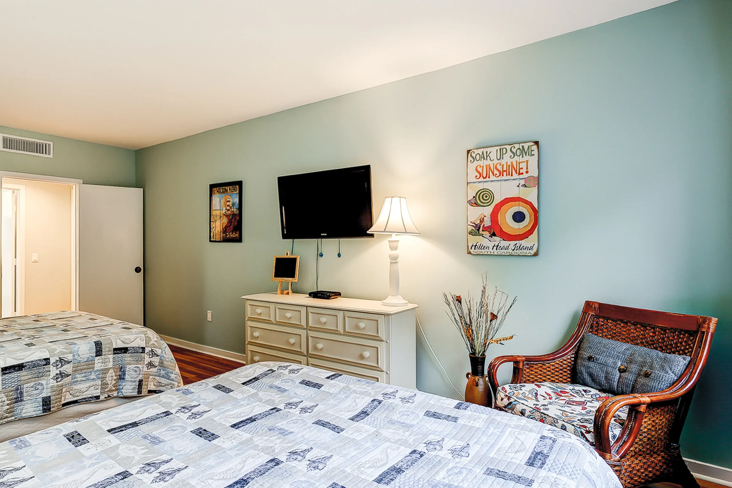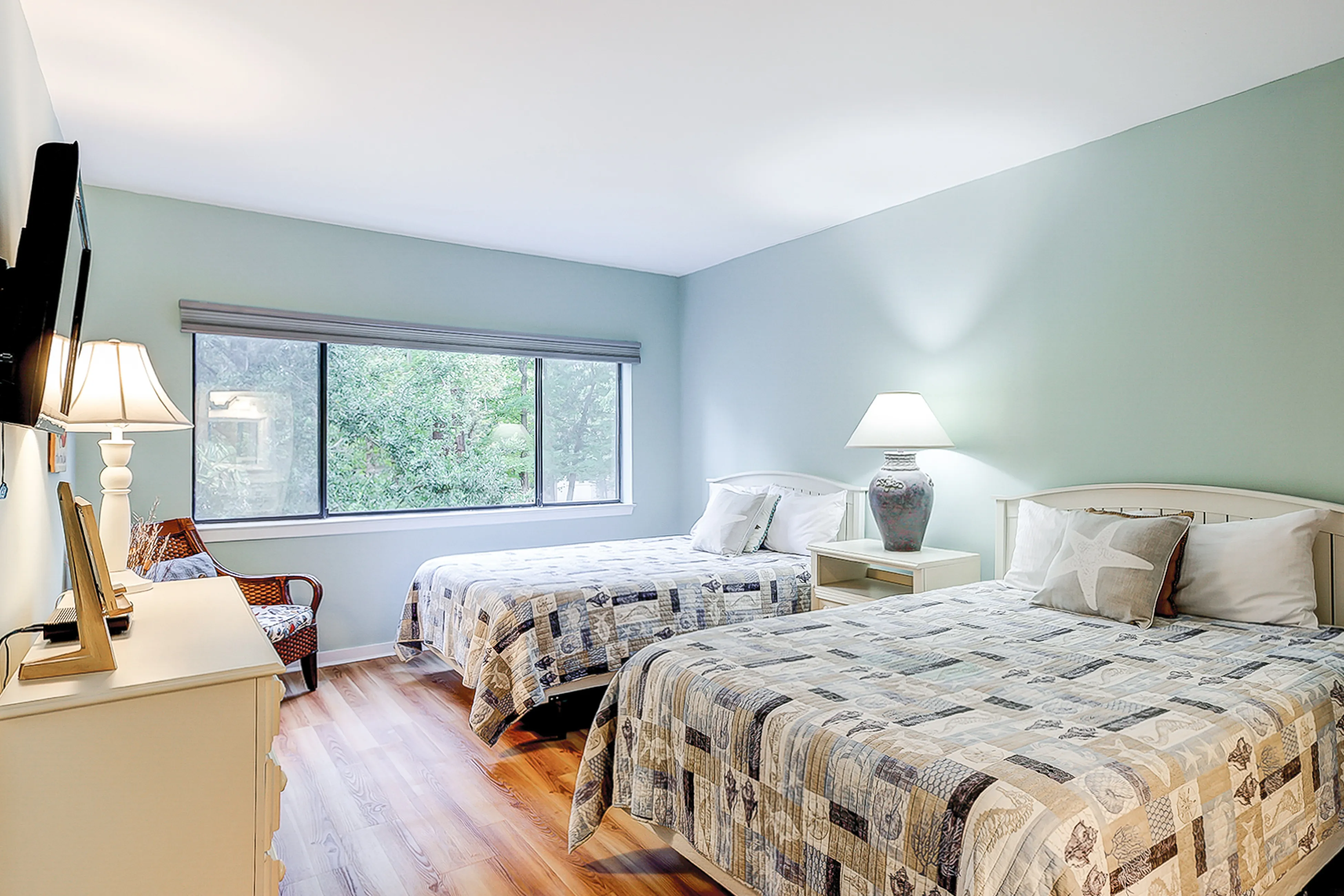 The main bedroom has a king bed, a wall-mounted flatscreen TV, balcony access, and an updated private bathroom with a glass-enclosed walk-in shower. The guest bedroom has two queen beds, a flat panel TV, and access to a hallway bathroom with a glass-enclosed tub/shower combo. The Village House is a multi-story building with lobby entry (lobby locks after hours for security) and offers an unassigned community parking lot and access to a shared community pool.