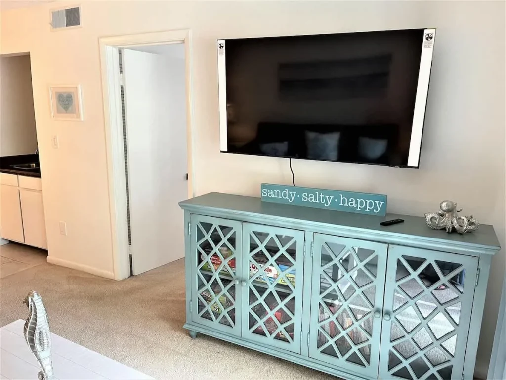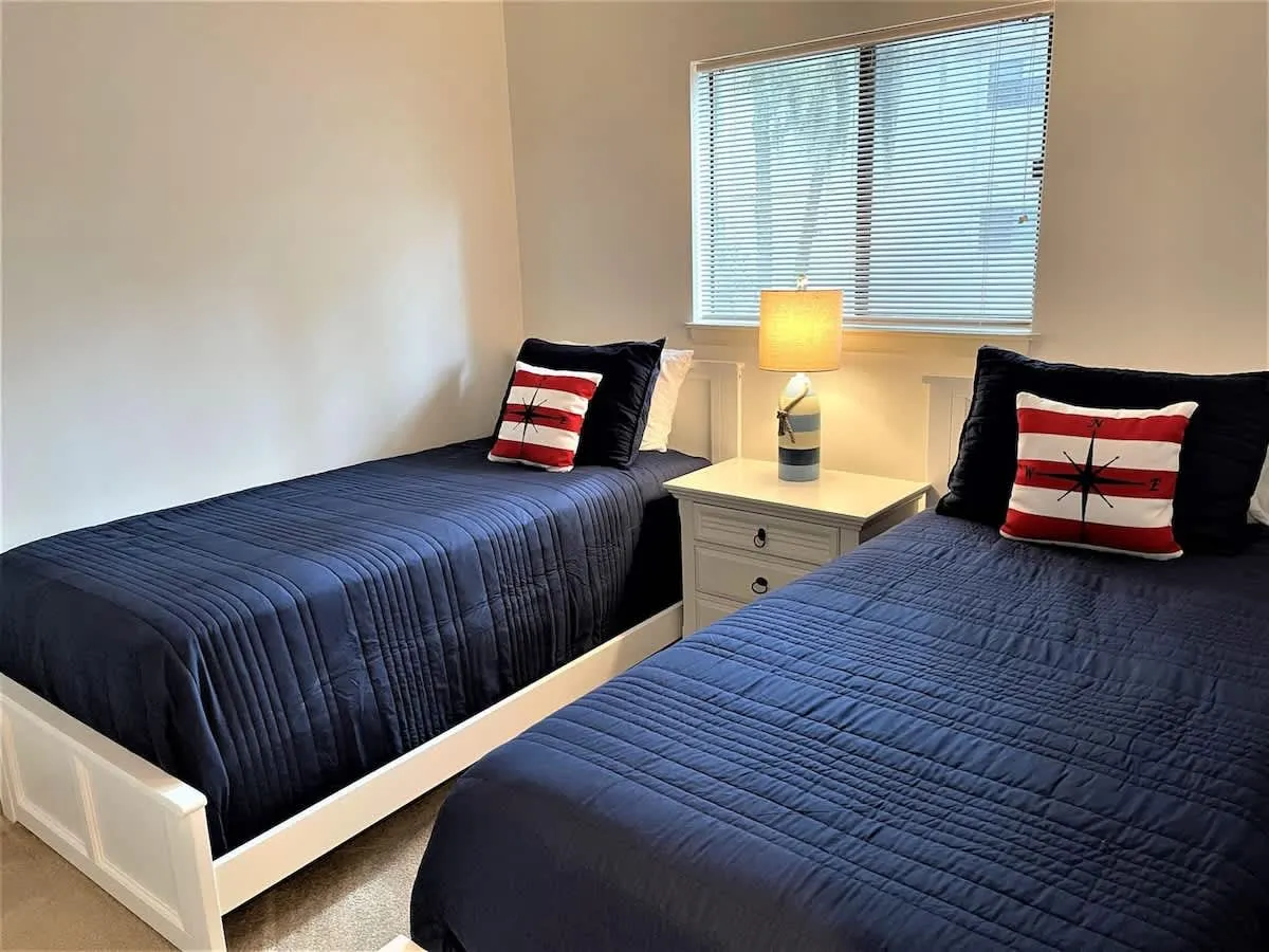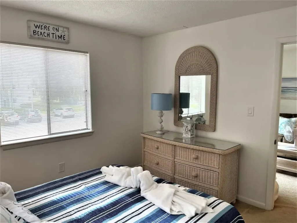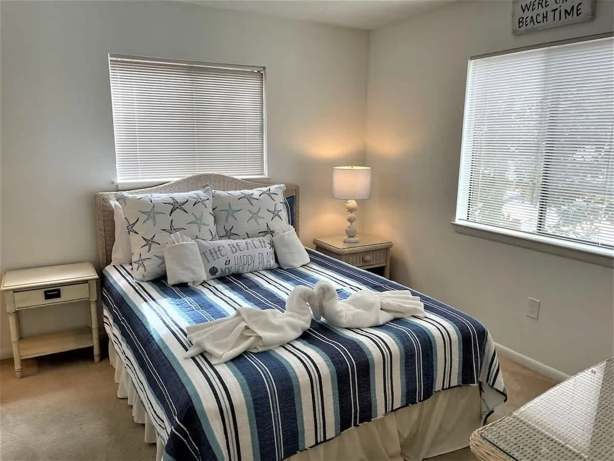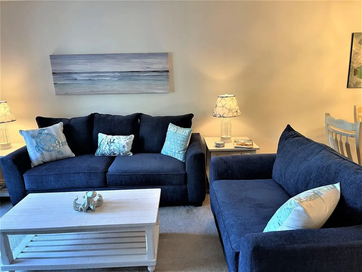 This quiet and charming 2nd floor villa offers an open floor plan with coastal feel and a view from the kitchen to the great room. The kitchen has stainless steel appliances, a coffee wet bar for your morning cup of java, a pantry closet and an in villa washer and dryer.. There is a nice sized deck for sitting and relaxing with brand new deck furniture. The Master Bedroom has a new queen bed and on suite private bath. The second bedroom has 2 new twin beds and a bath. The living room has a pull out queen sofa, a brand new credenza filled with games and books for your entertainment.
