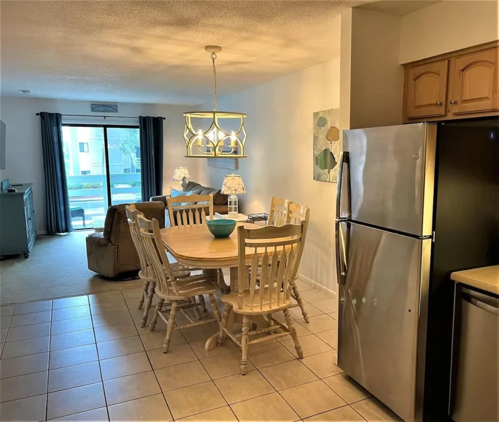 This quiet and charming 2nd floor villa offers an open floor plan with coastal feel and a view from the kitchen to the great room. The kitchen