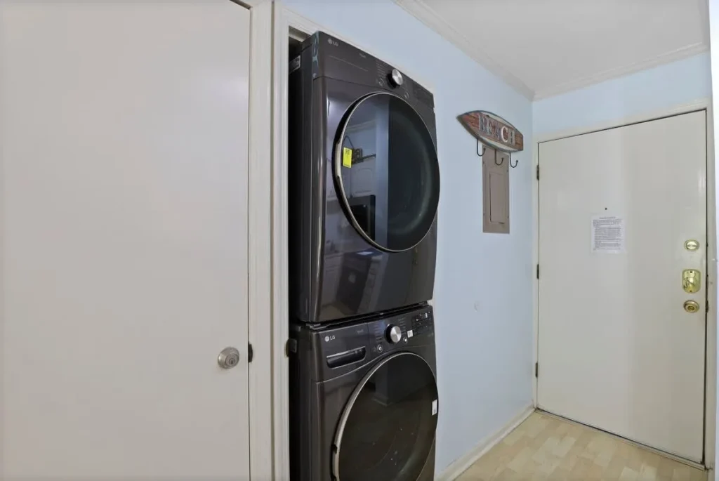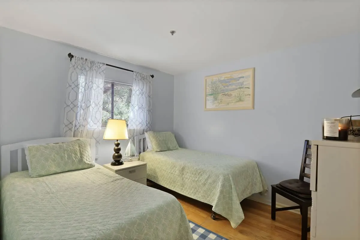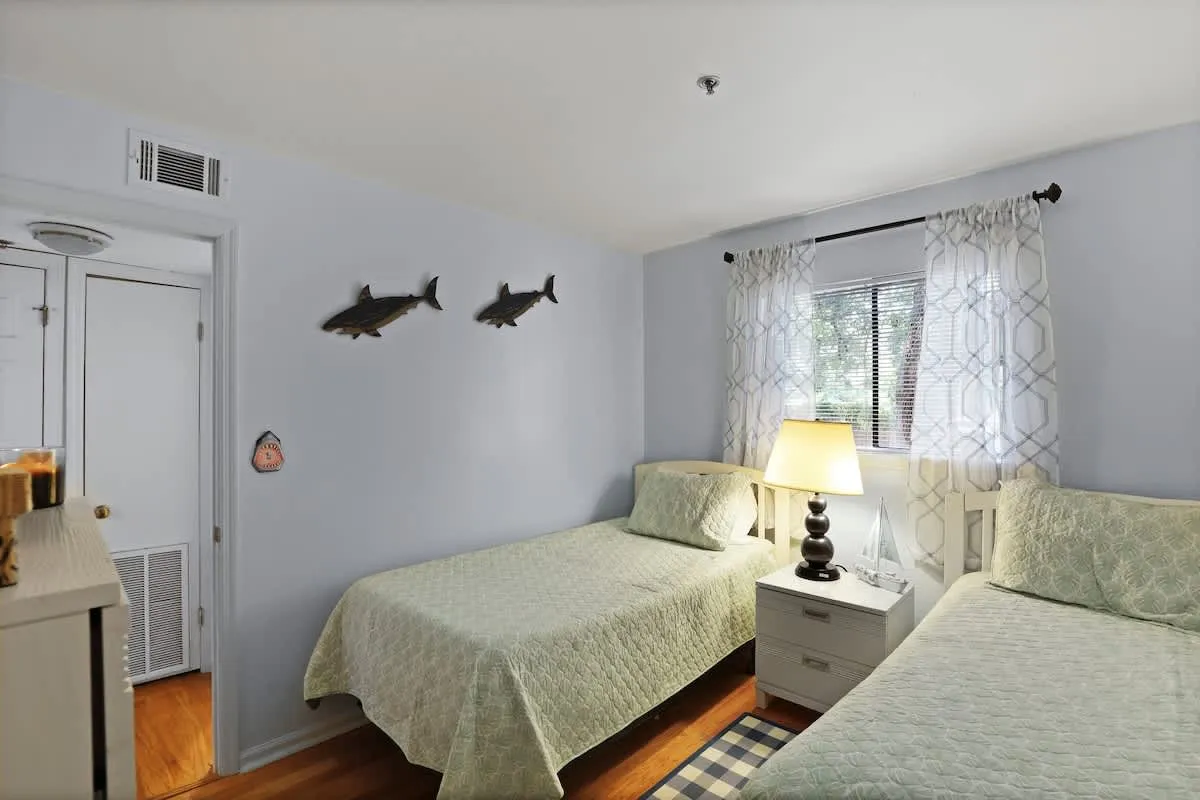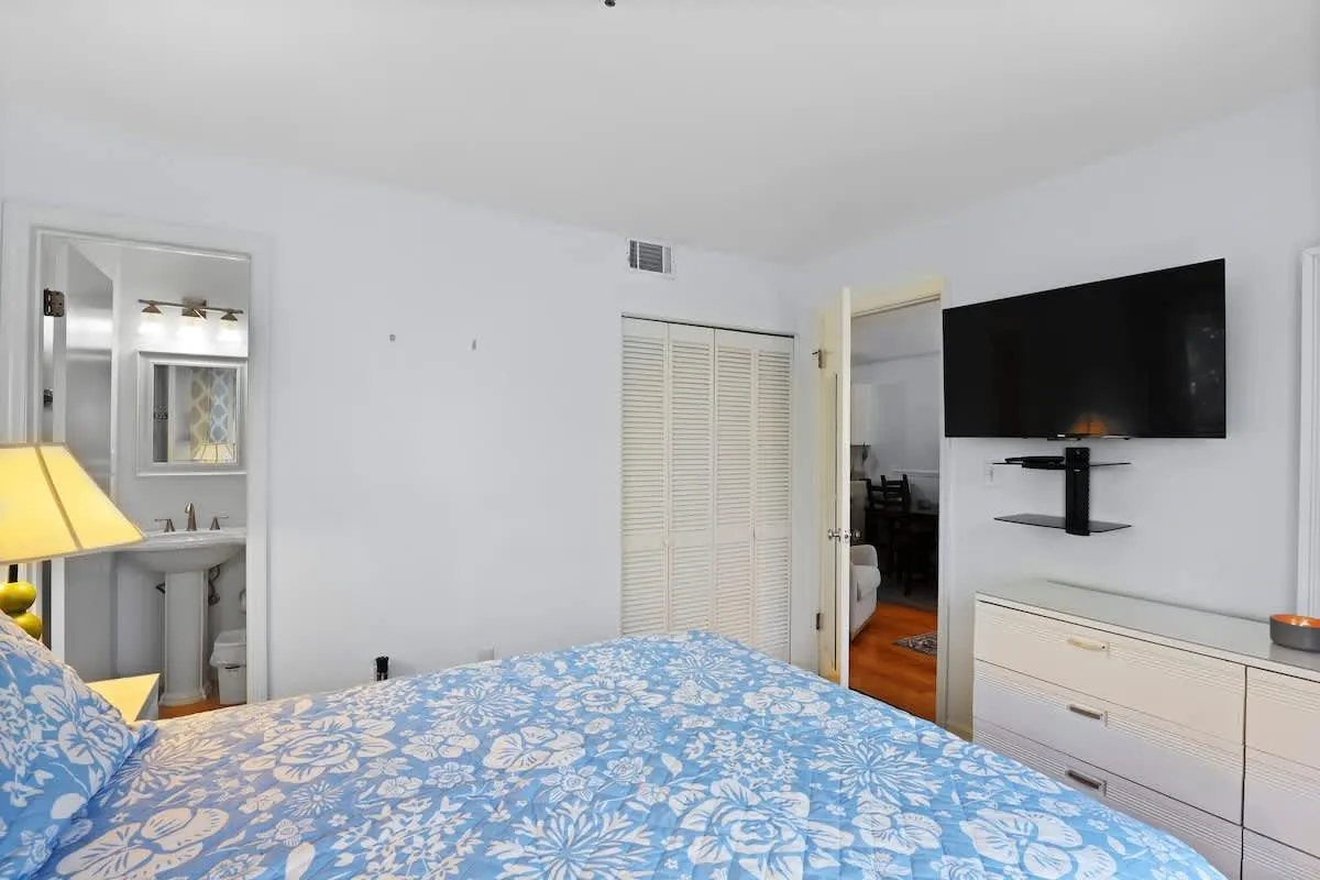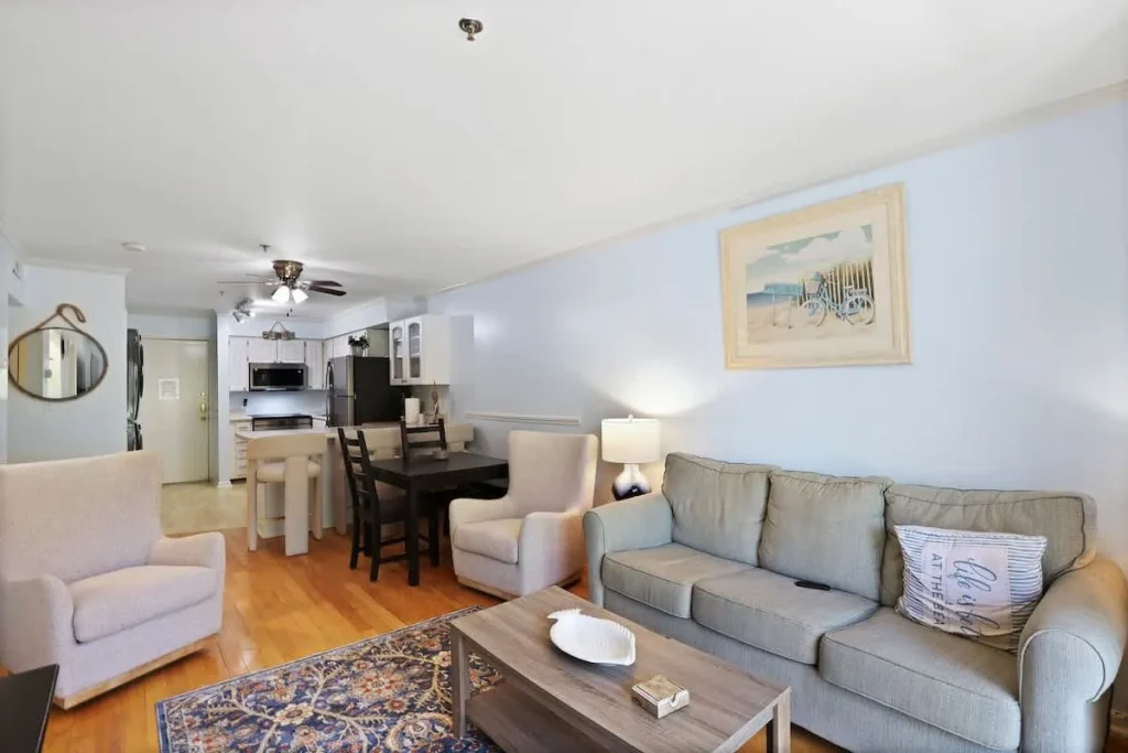 The primary suite offers a serene queen-sized bed and private en-suite bath, while the second bedroom features two twin beds, perfect for children or friends. For additional guests, the living area includes a comfortable pull-out sofa. Large windows invite natural light into the open-concept living and dining space, creating an airy atmosphere for post-beach relaxation.