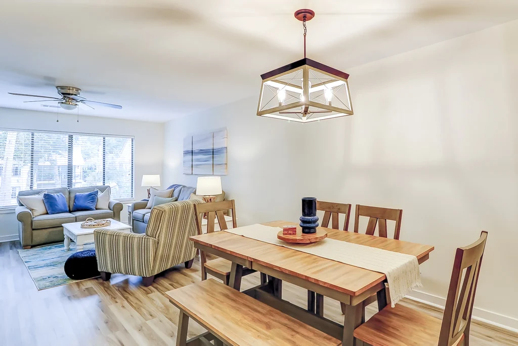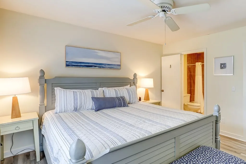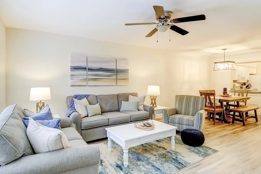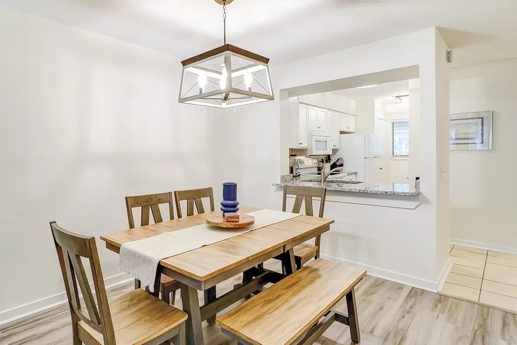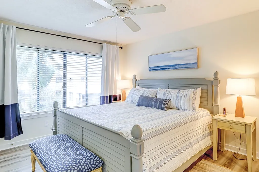 Perfect for a relaxing getaway to Hilton Head Island, this two-story condo has all of the comforts of home in a serene package that is sure to spoil you and your guests. The complex is within walking distance to the beach and many attractions, but is very quiet and relaxing so it’s great for families. From the well-equipped, full kitchen to the spacious dining area and the inviting, beach-themed living area with matching so