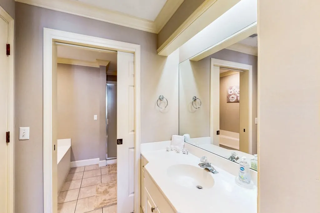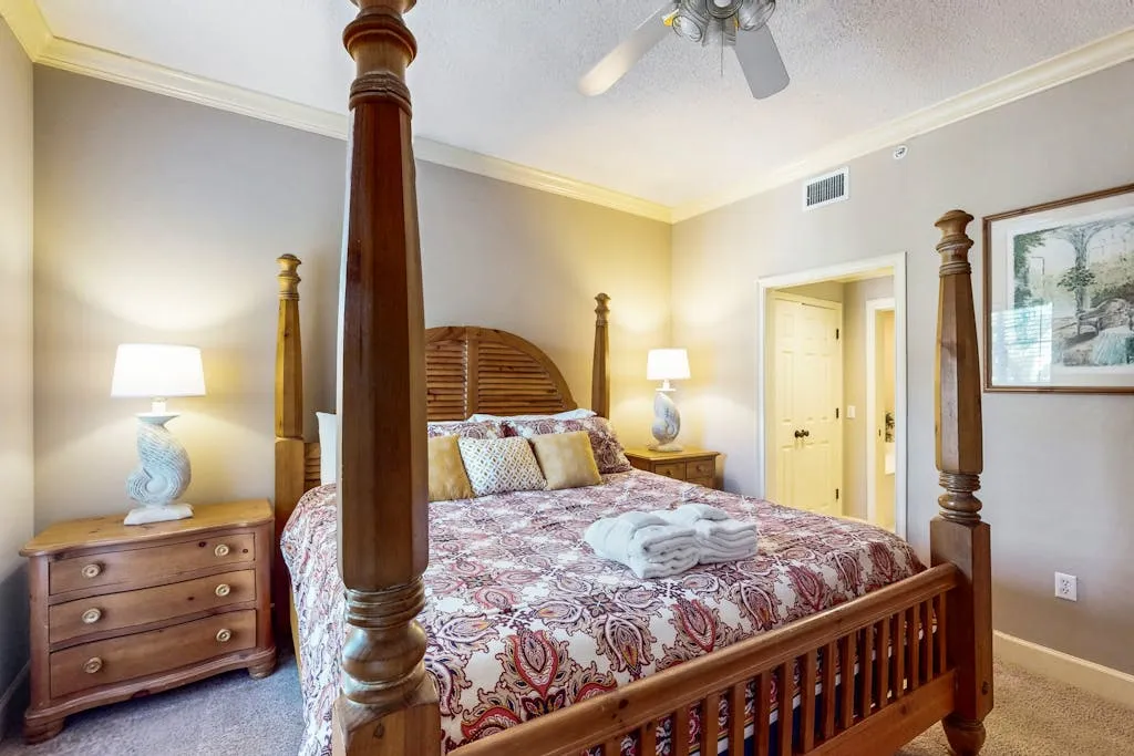 As you enter the villa, you’ll find an open floor plan, lots of natural light, and tile flooring throughout the living areas. The living area features a comfortable sofa, free