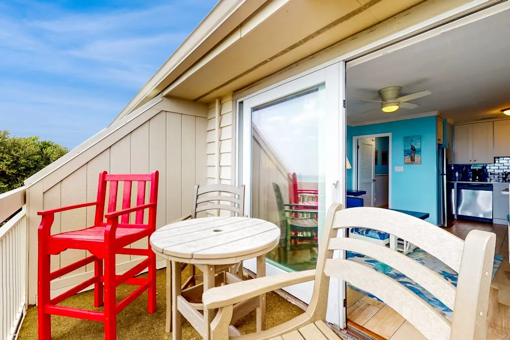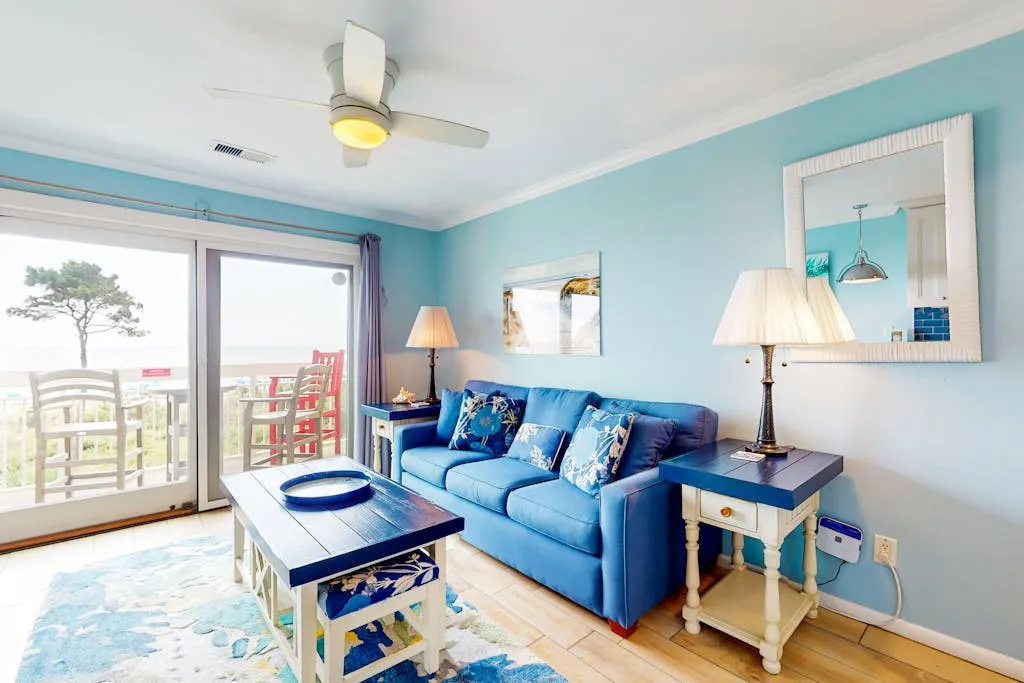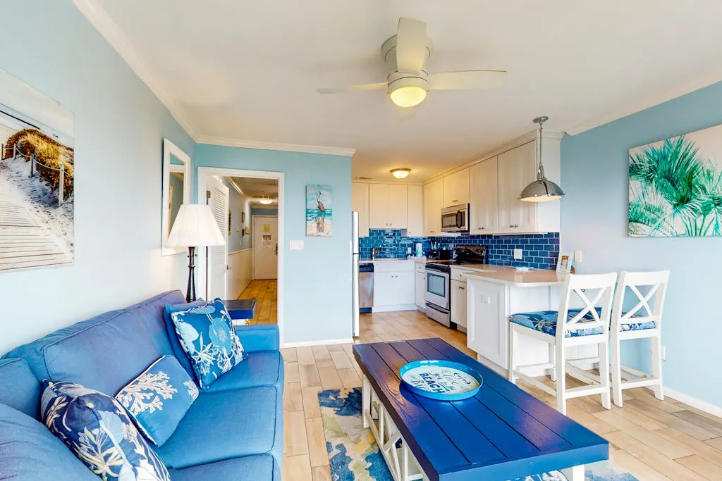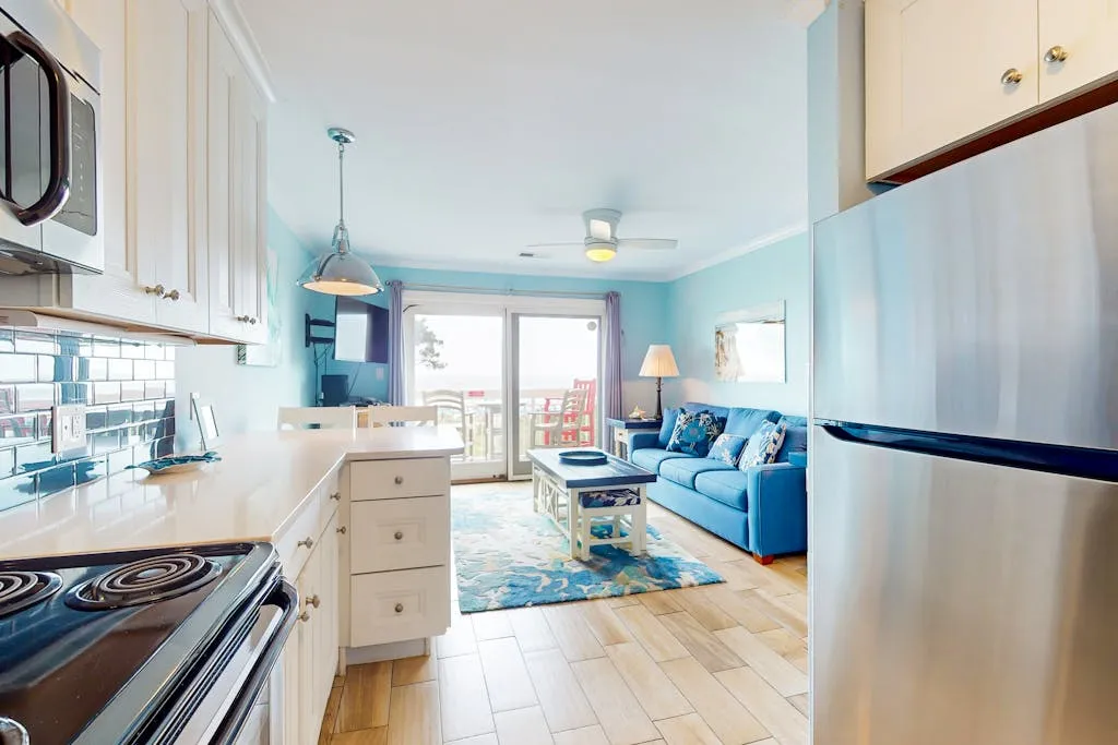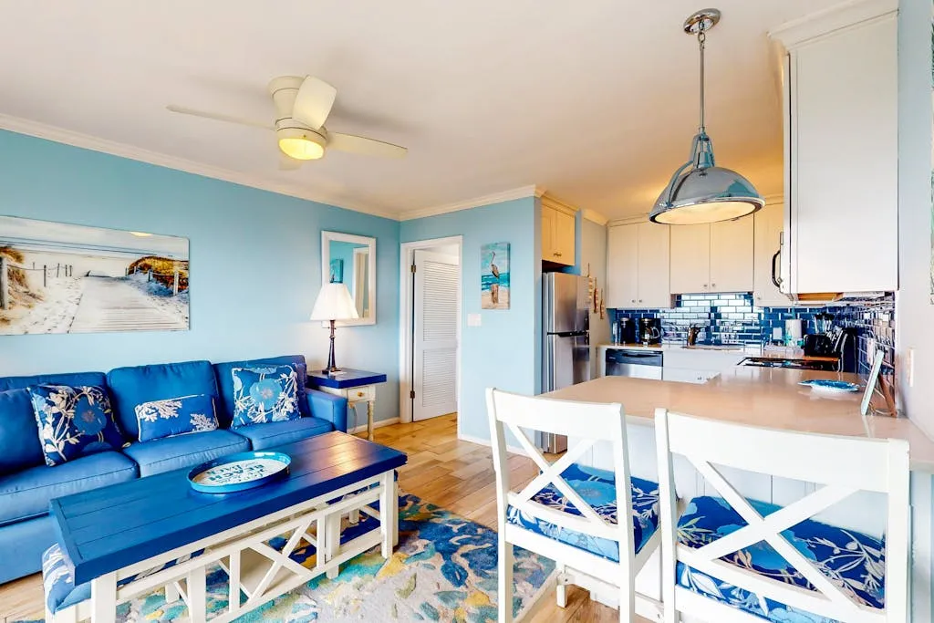 This direct oceanfront condo offers the absolute best views on the Island! This home features a bright and inviting living area with a large, flat screen TV, a full, well-equipped kitchen with stainless steel appliances, granite countertops, and a cozy breakfast bar, plus a furnished top floor balcony from where you can enjoy spectacular sunrises over the ocean. Guests will also enjoy access to the shared pool and a children’s pool if the kids are joining you.