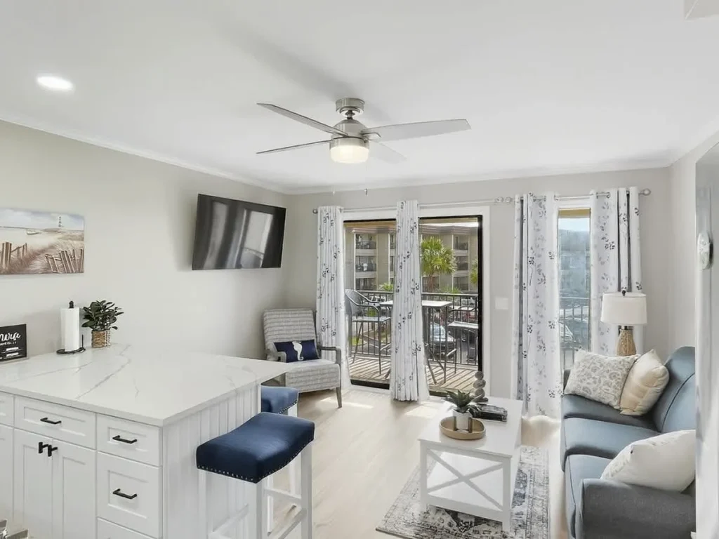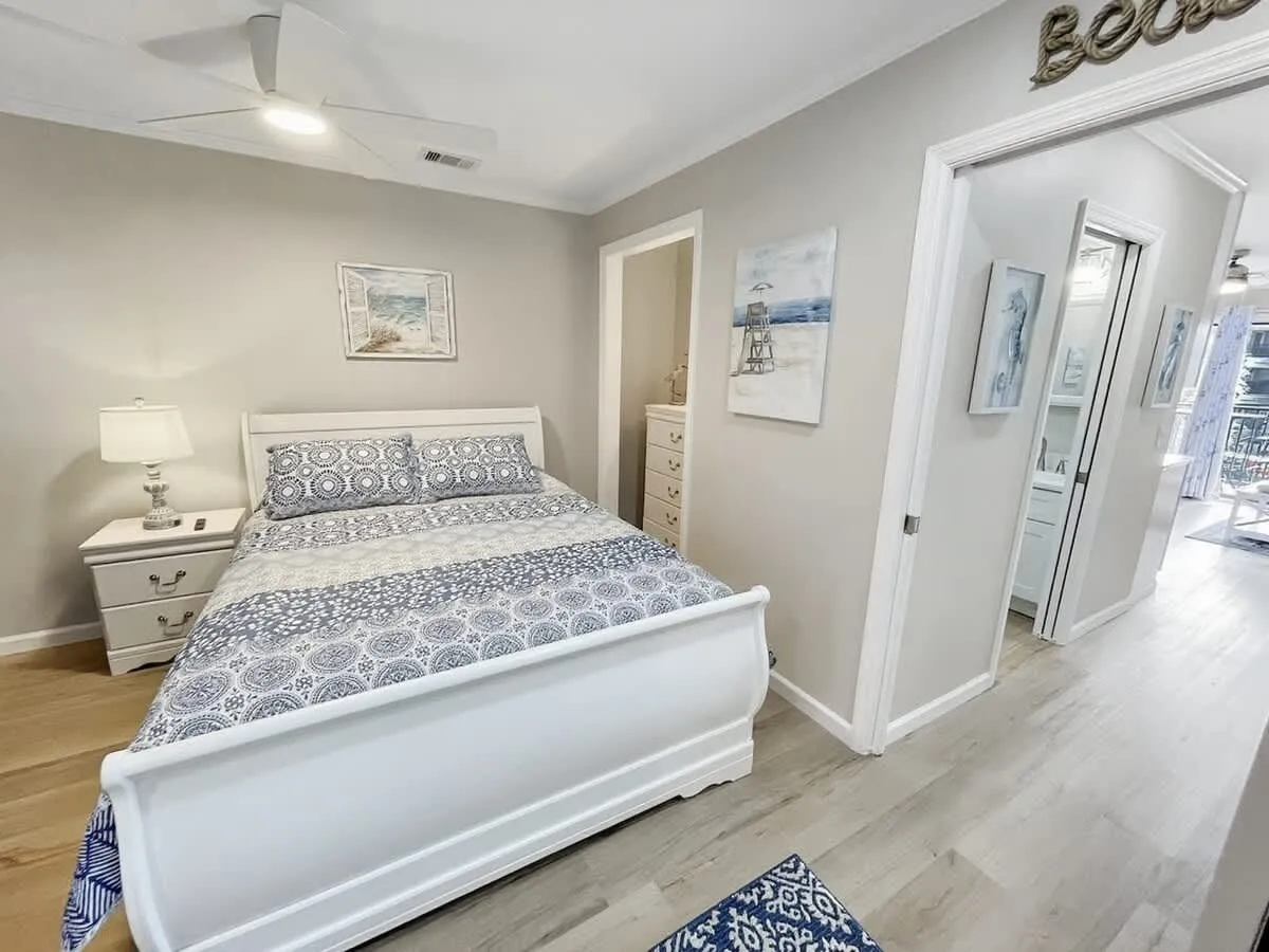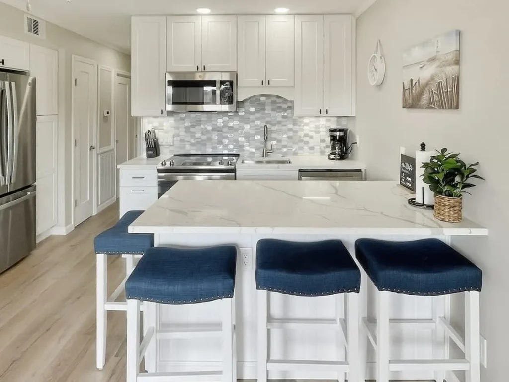 Living & Dining: The open-concept living area features wide-plank luxury vinyl flooring and a queen sleeper sofa to accommodate extra guests. Large sliding glass doors flood the space with natural light. Gourmet Kitchen: The chef-inspired kitchen has been expanded with a functional island, white shaker cabinetry, and elegant quartz countertops. It is fully equipped for preparing everything from beach snacks to full dinners. Bedroom & Bath: The private primary bedroom offers a serene sanctuary with premium linens and coastal decor. The bathroom is a standout feature, boasting a custom designer-tiled walk-in shower, a modern white vanity, and extra counter space for your essentials. Modern Tech: High-speed Wi-Fi and smart TVs ensure you stay connected and entertained during your downtime.