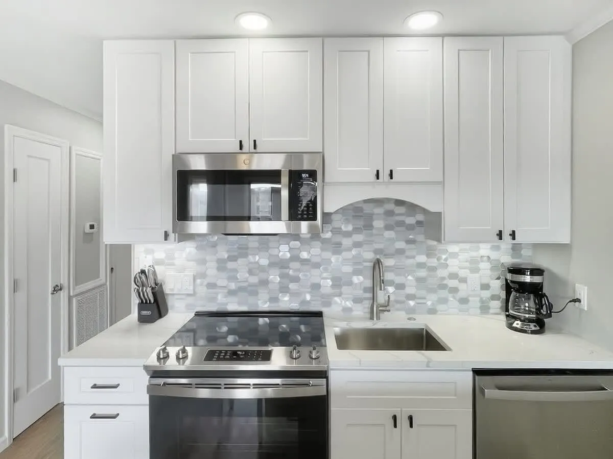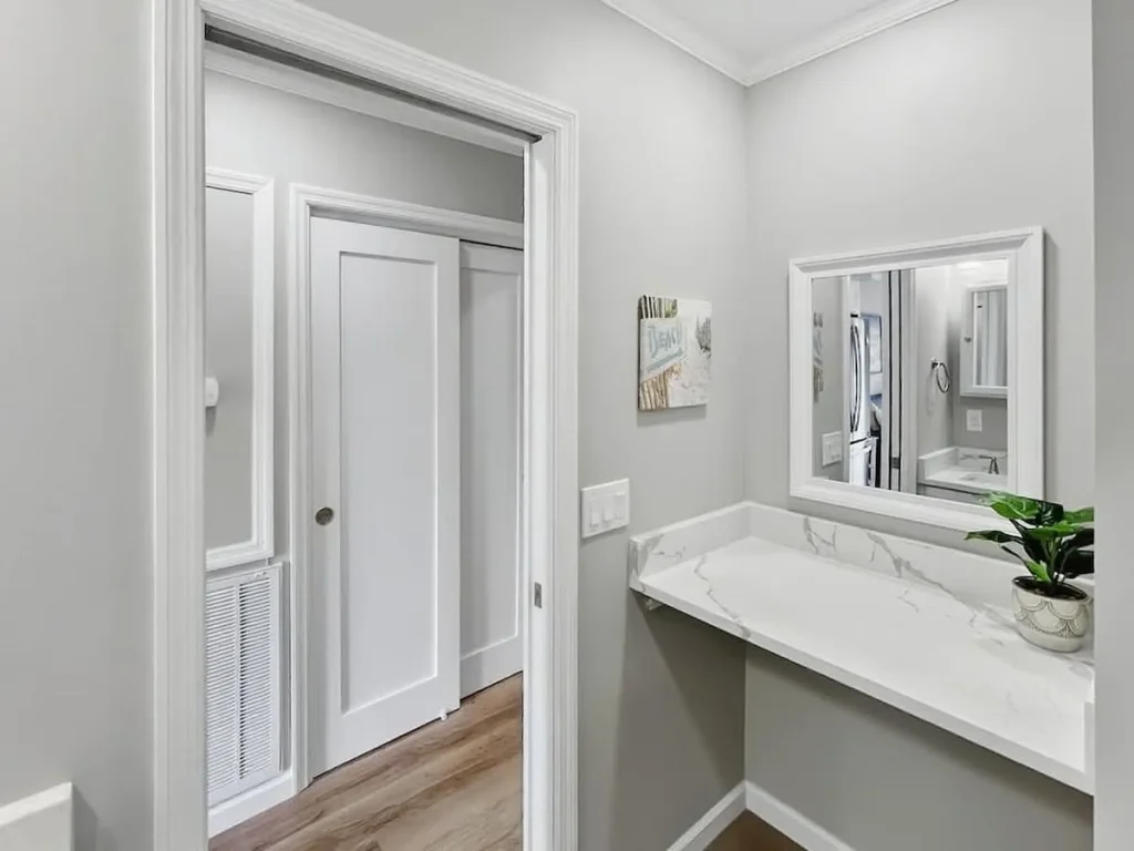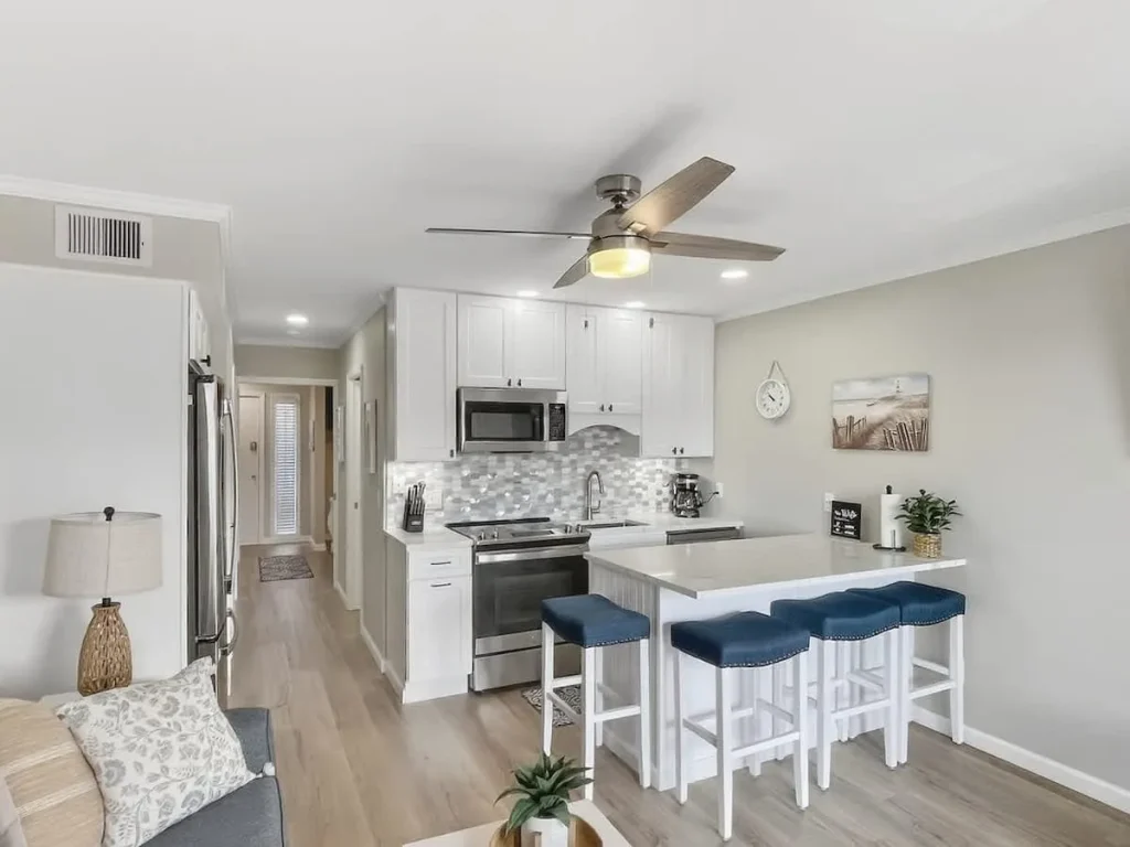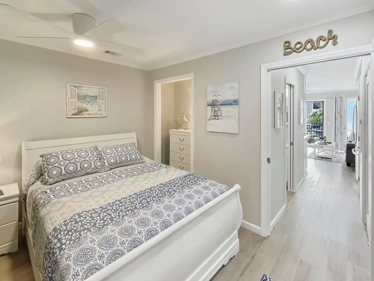 Living & Dining: The open-concept living area features wide-plank luxury vinyl flooring and a queen sleeper sofa to accommodate extra guests. Large sliding glass doors flood the space with natural light. Gourmet Kitchen: The chef-inspired kitchen has been expanded with a functional island, white shaker cabinetry, and elegant quartz countertops. It is fully equipped for preparing everything from beach snacks to full dinners. Bedroom & Bath: The private primary bedroom offers a serene sanctuary with premium linens and coastal decor. The bathroom is a standout feature, boasting a custom designer-tiled walk-in shower, a modern white vanity, and extra counter space for your essentials. Modern Tech: High-speed Wi-Fi and smart TVs ensure you stay connected and entertained during your downtime.