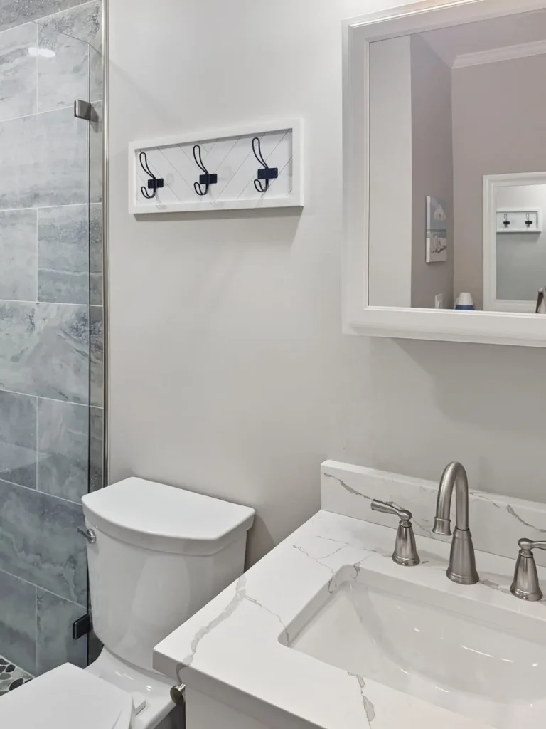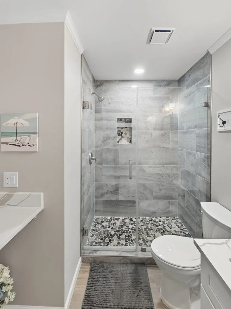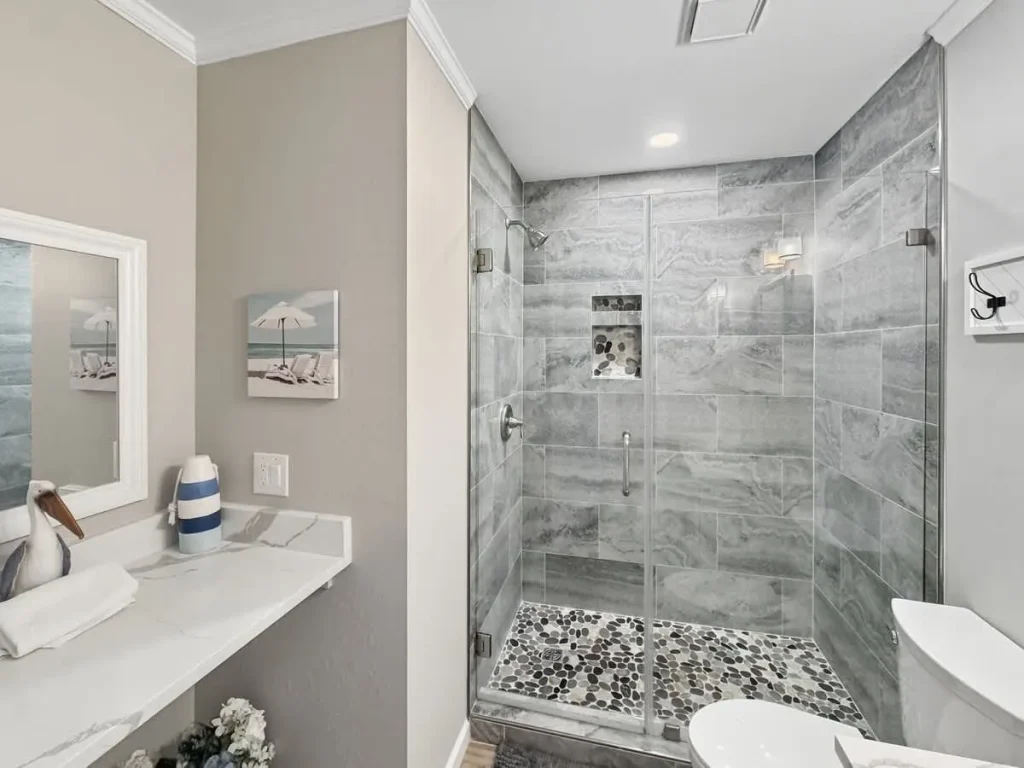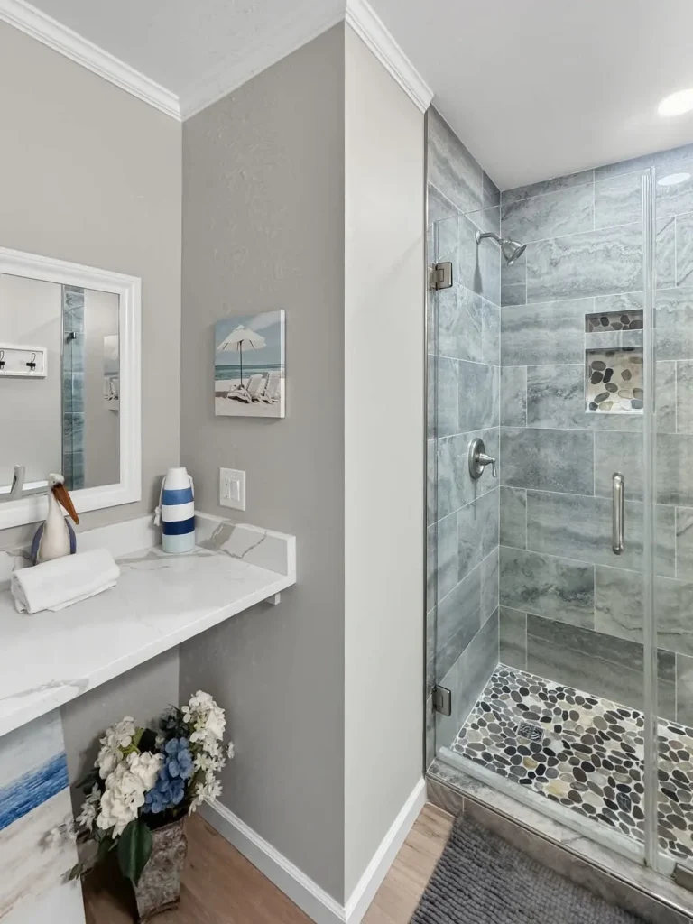* DESIGNER-TILED WALK-IN SHOWER with white vanity and bonus counter space