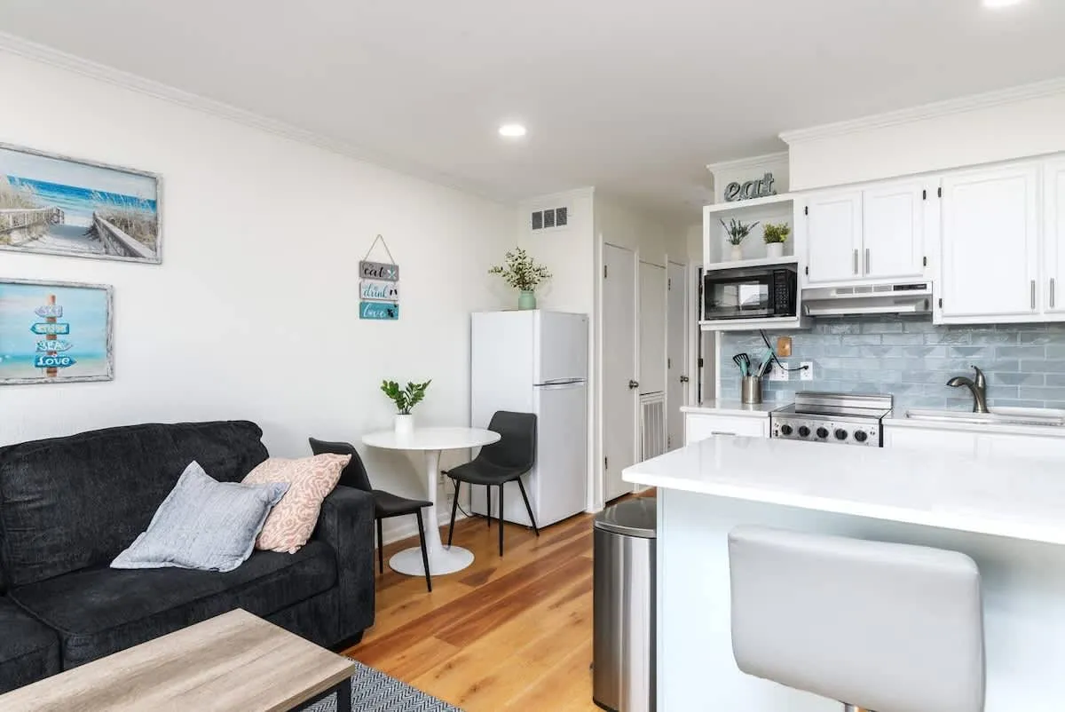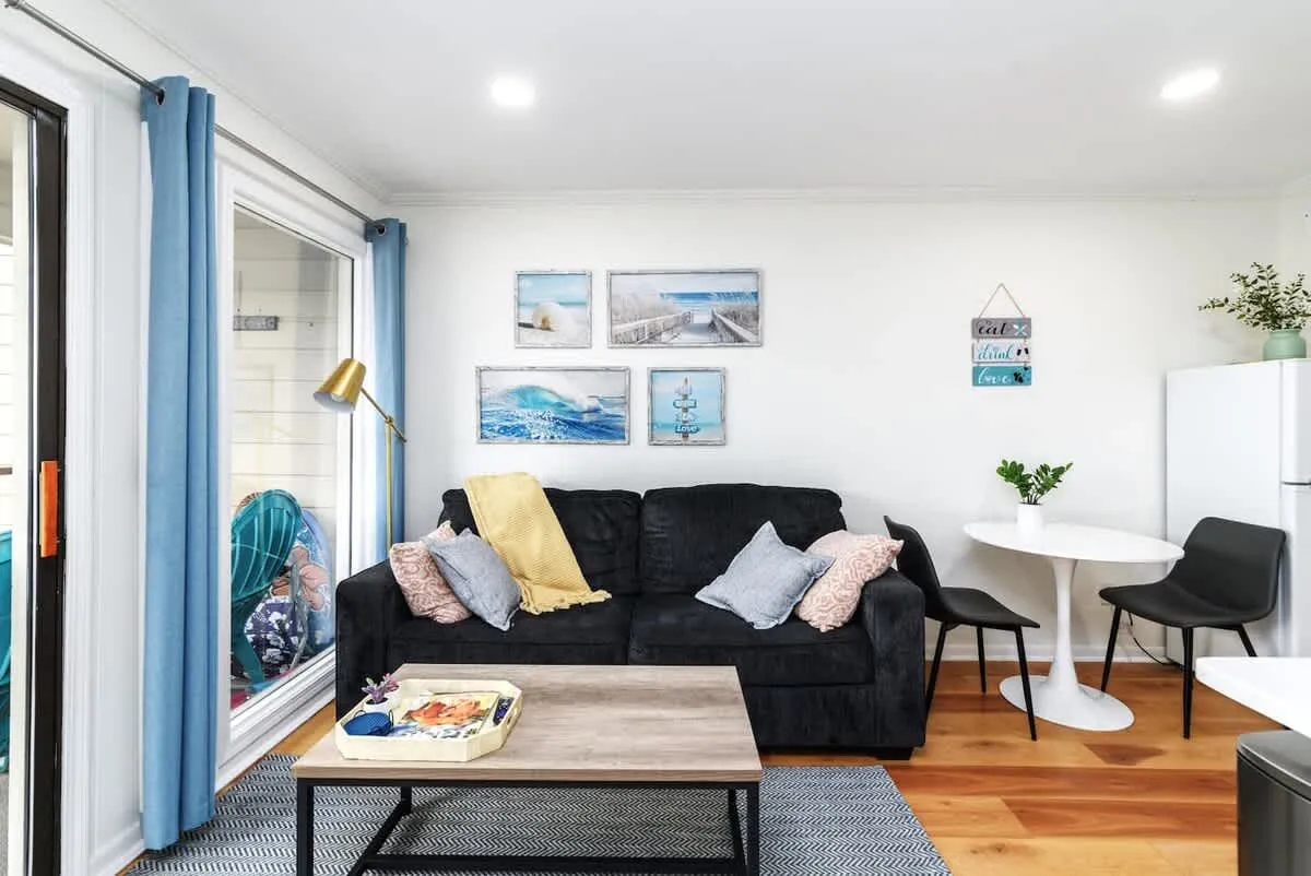 Living Area: Relax on all-new furniture in a bright, airy living room accented by coastal designer colors and luxury vinyl plank flooring. A queen-size pull-out sofa provides additional sleeping options.