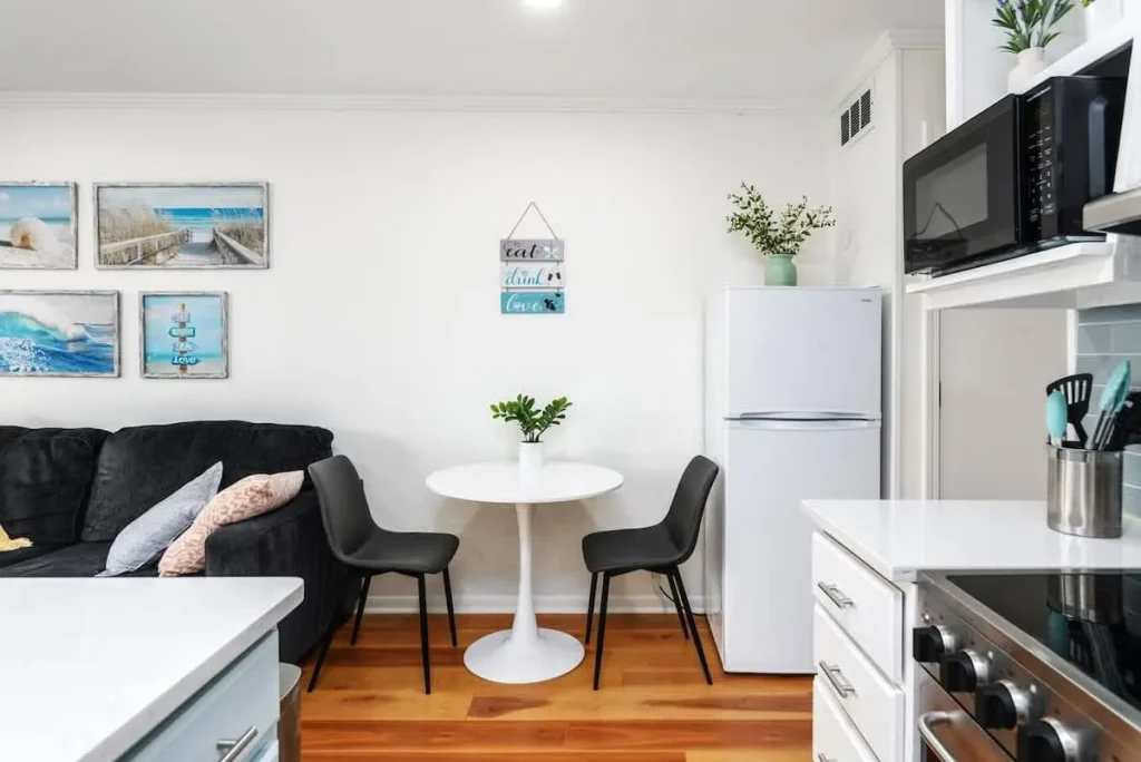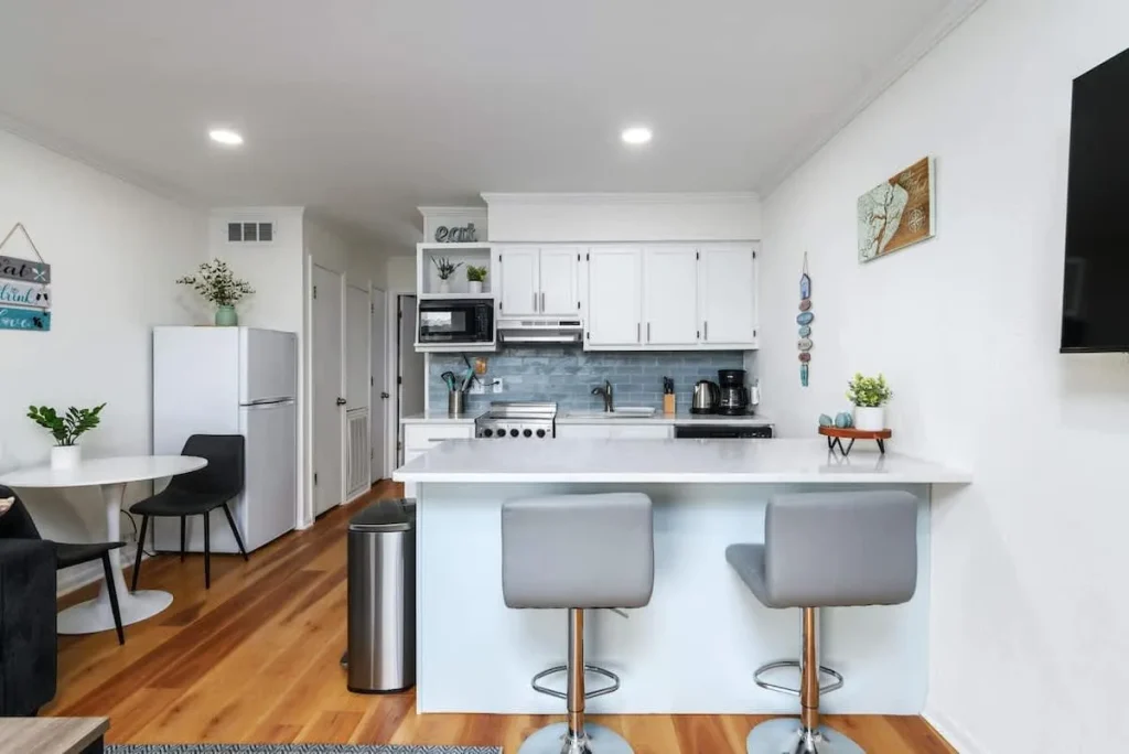 Kitchen & Dining: The heart of the home features brilliant white shaker cabinetry, premium quartz countertops, and a functional kitchen island. High-end finishes and an open layout make meal prep a breeze, while the space remains connected to the living area.