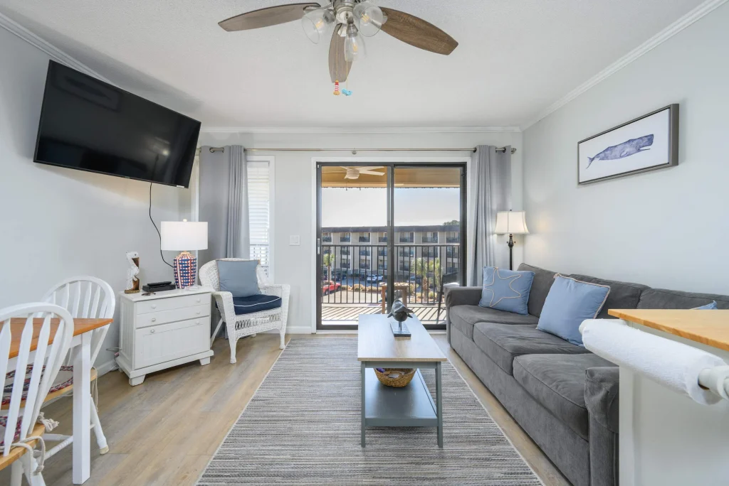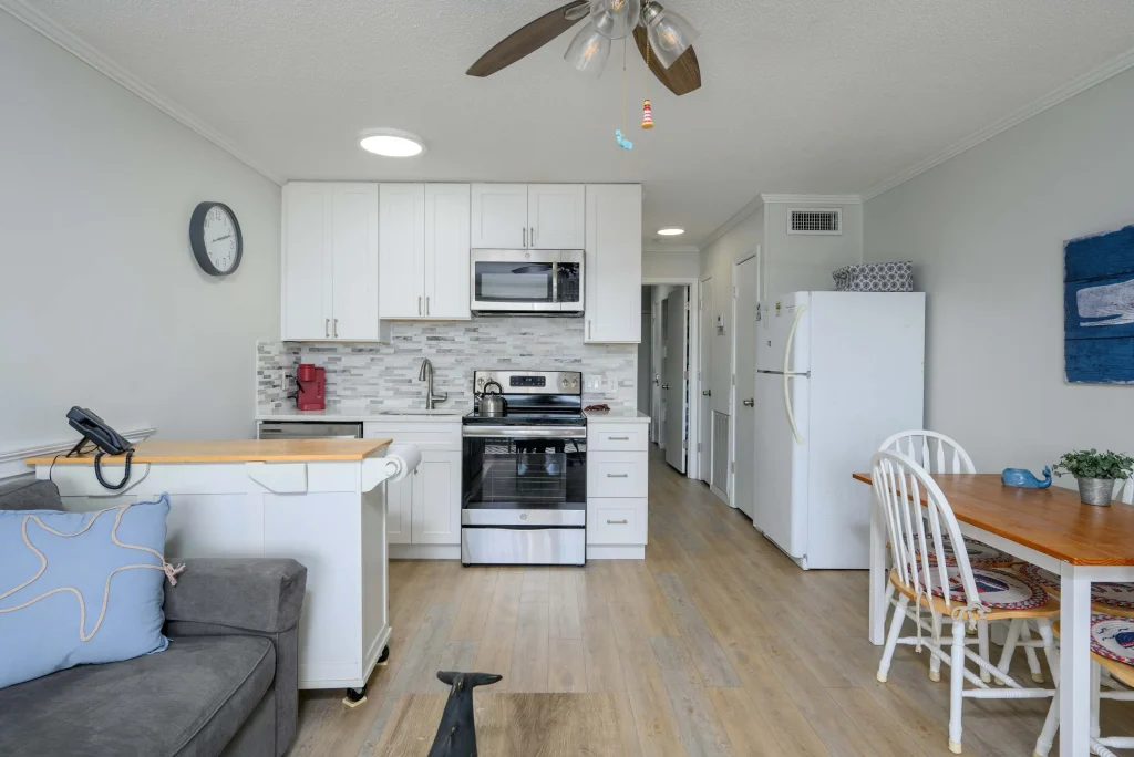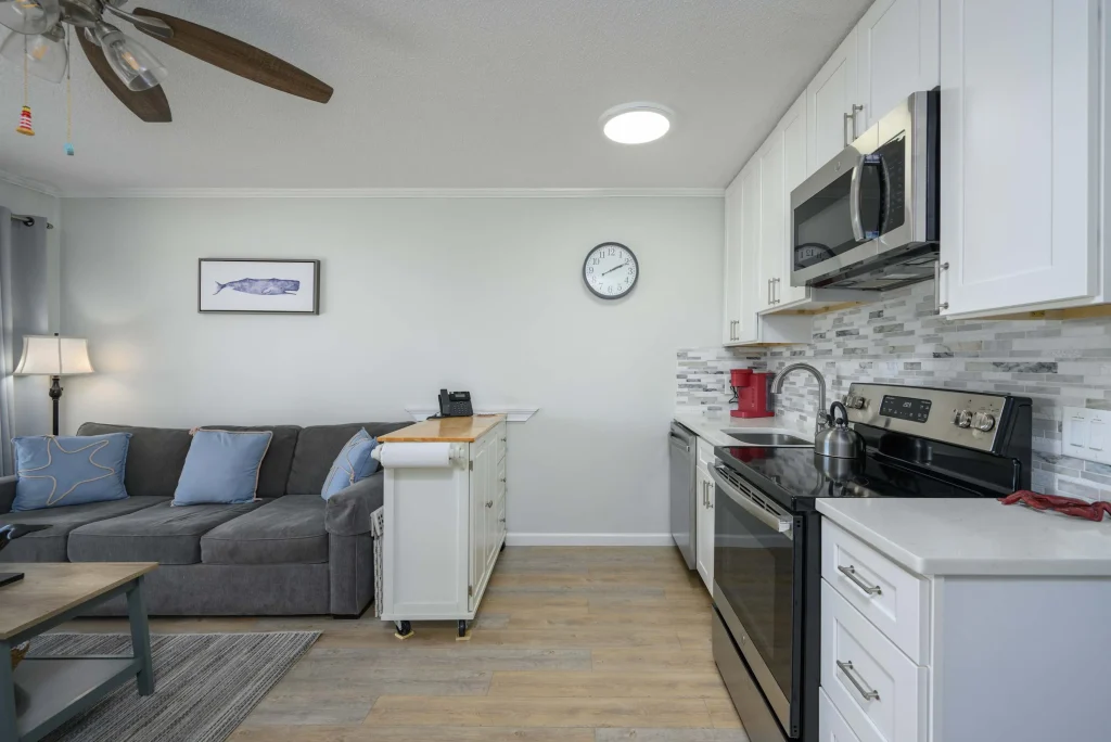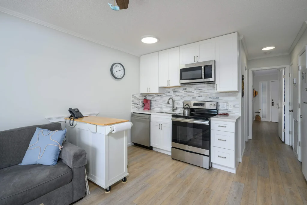 The living space opens to a private balcony where you can enjoy refreshing ocean breezes and relaxing views. A fully equipped kitchen makes it easy to prepare meals, while the cozy seating area provides the perfect spot to unwind after a beach day.