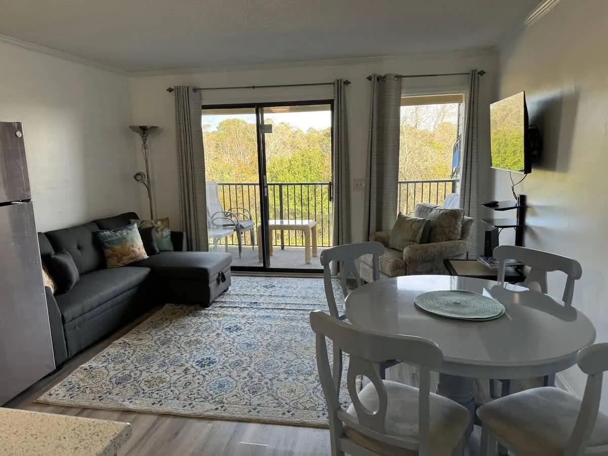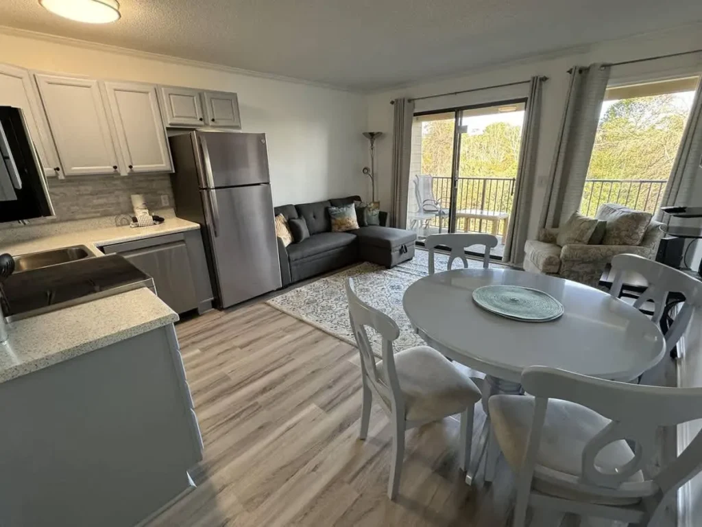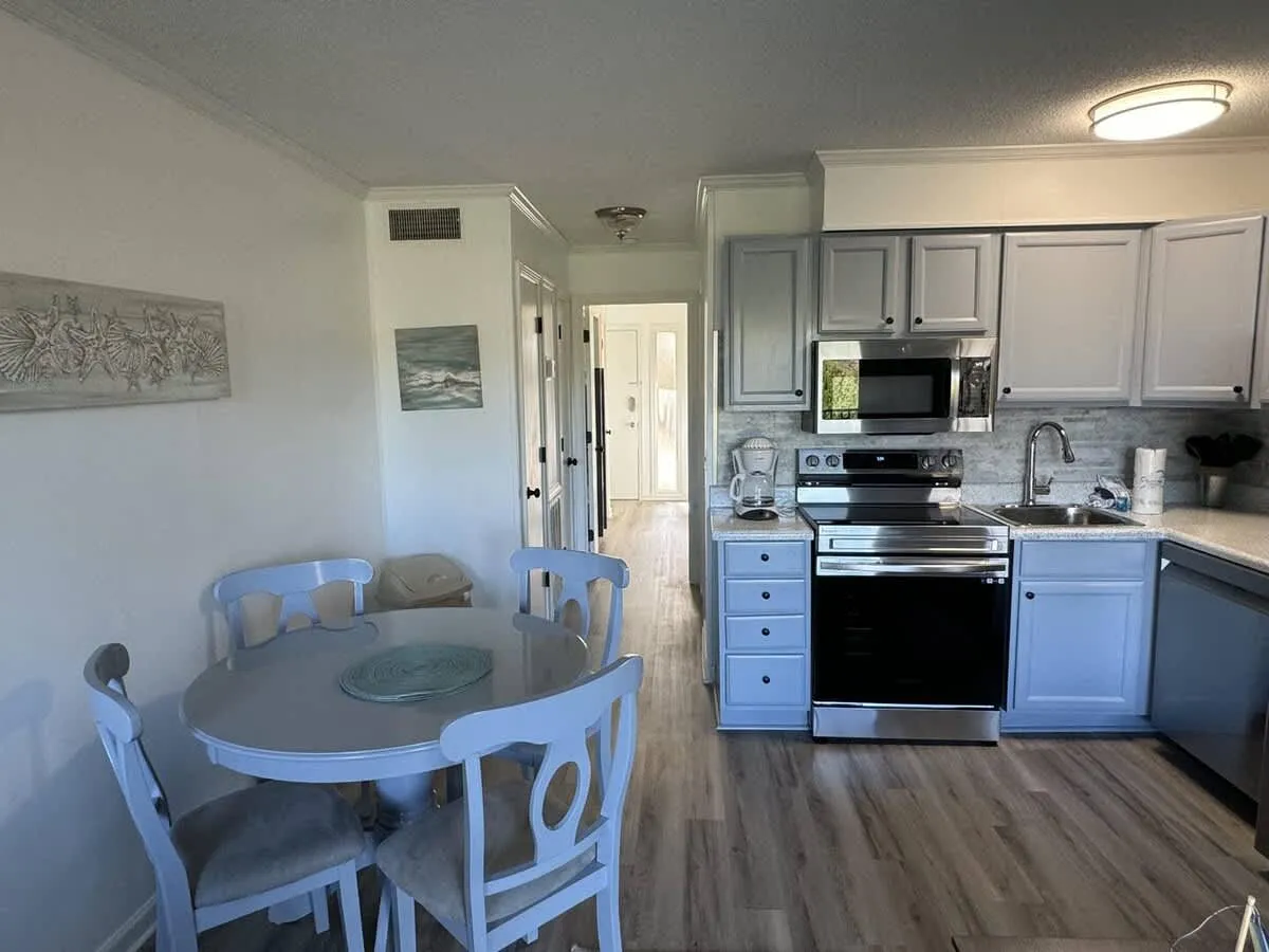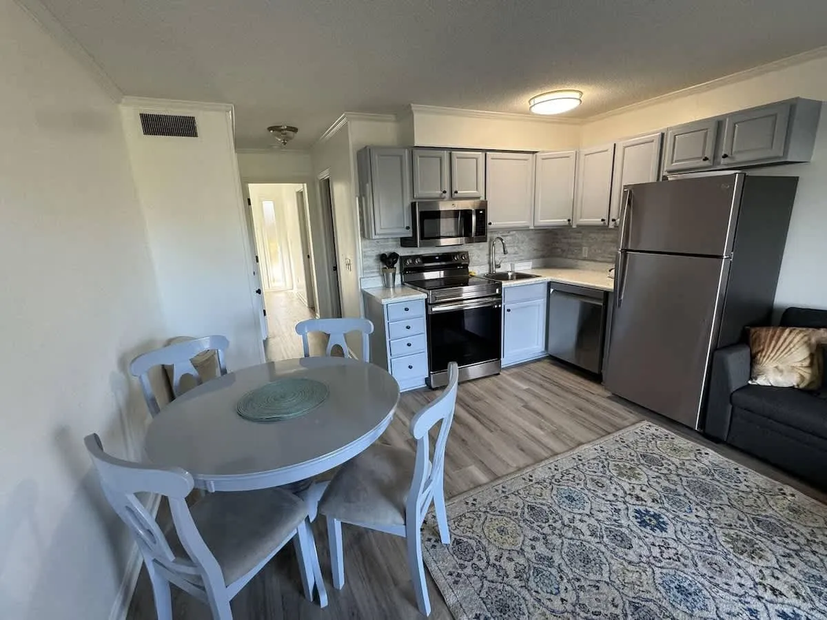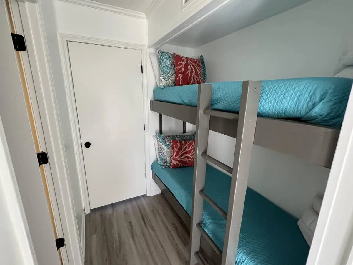 Cozy 1 bedroom with a set of bunks and pullout sofa. This villa has been updated with new coastal grey wood laminate flooring and paint.