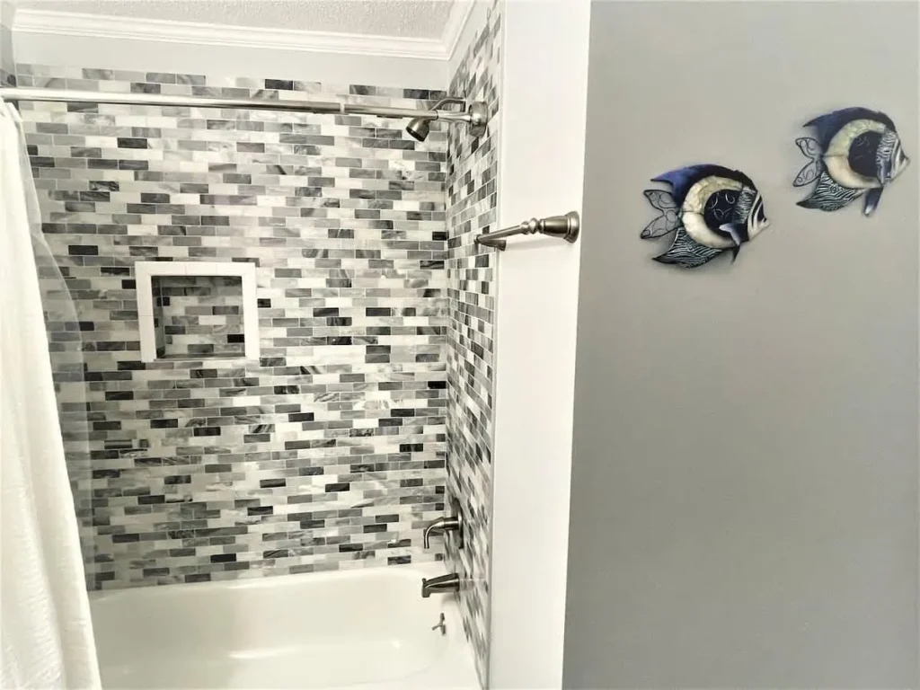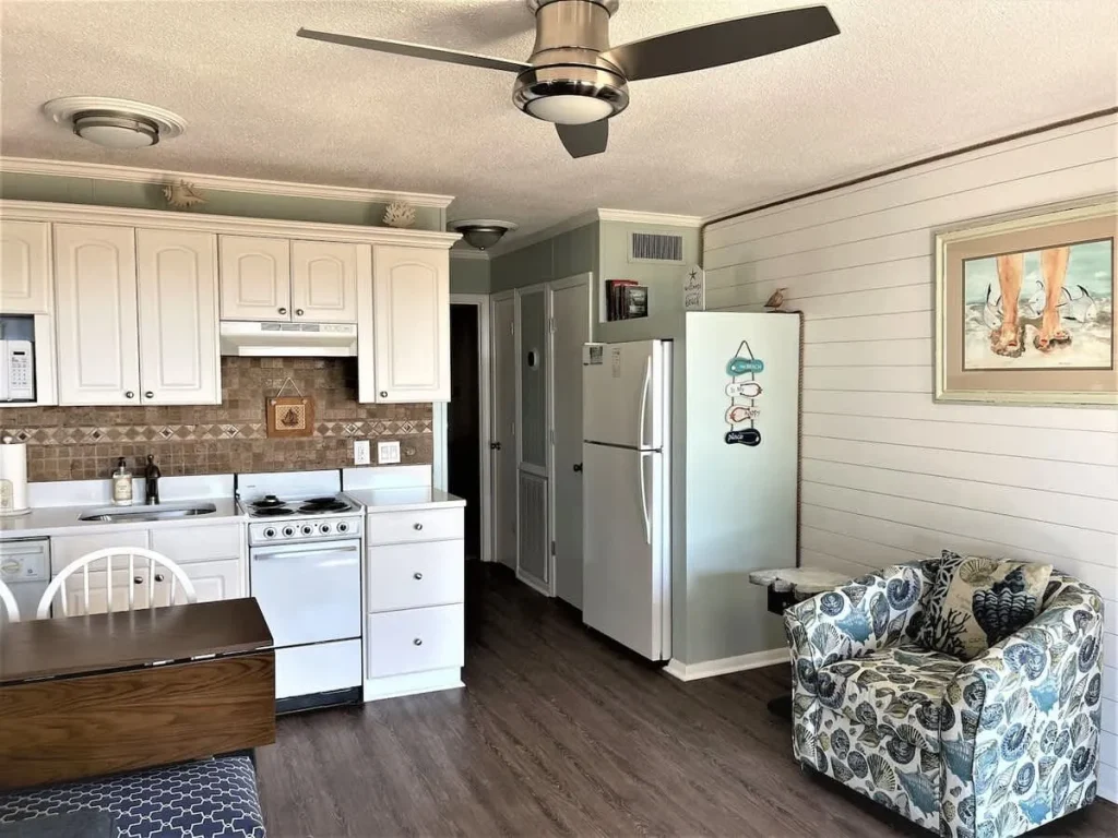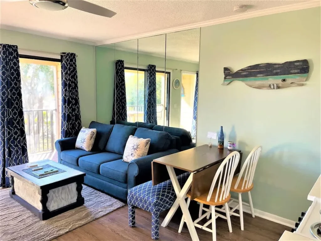 The location of this fully renovated villa is Ocean Front Villa is the best, and it is just steps from the beach boardwalk and resort pool. This 1-bedroom villa was recently remodeled with a brand-new bath, wide plank luxury vinyl floors, new living room furniture which includes a new queen pull out sofa with a 3″ memory foam mattress, shiplap walls, new quartz countertops, and all new deck furniture and beach chairs. The bedroom is private and has a private entrance to the bathroom. The villa easily fits 2 couples or a family of 4. The kitchen is fully equipped to cook and eat in, or you can enjoy a meal at the balcony table. You can enjoy beautiful, serene sunrises right from you balcony.