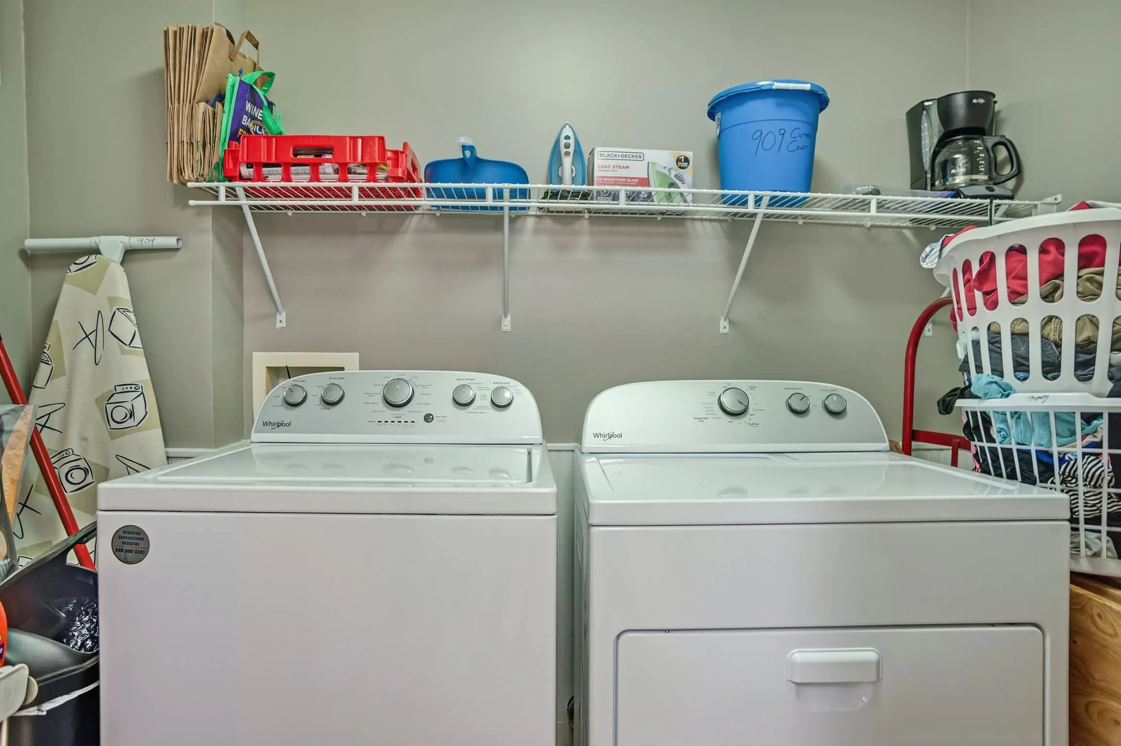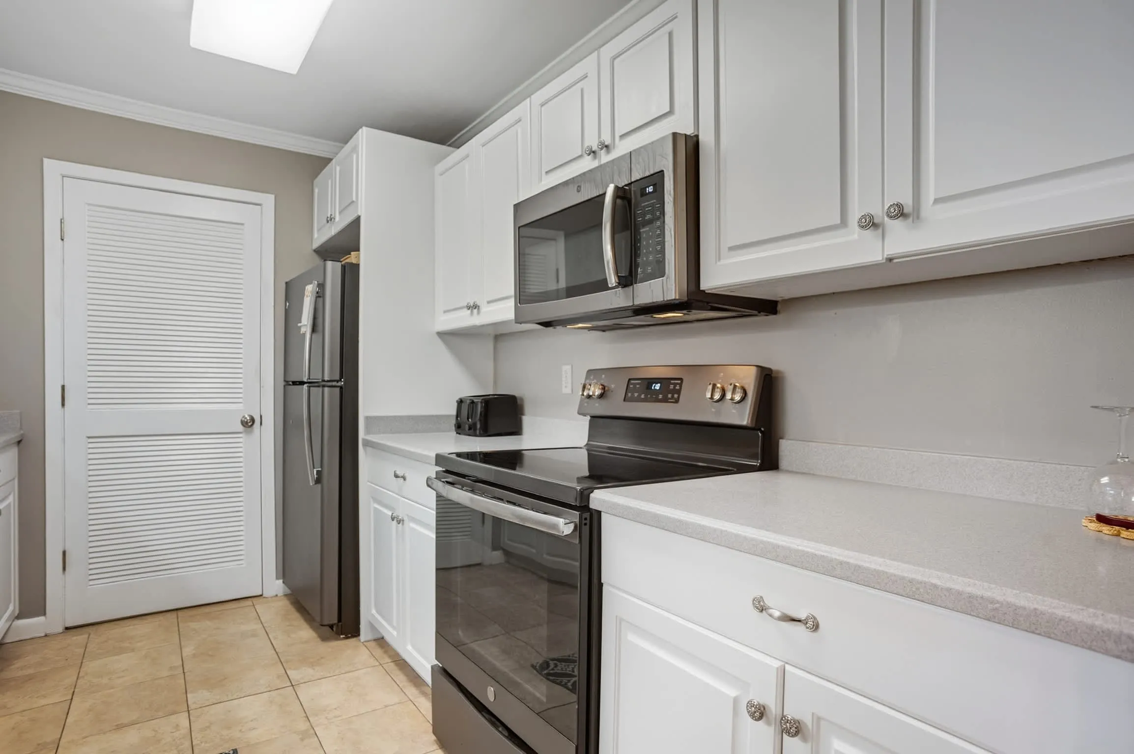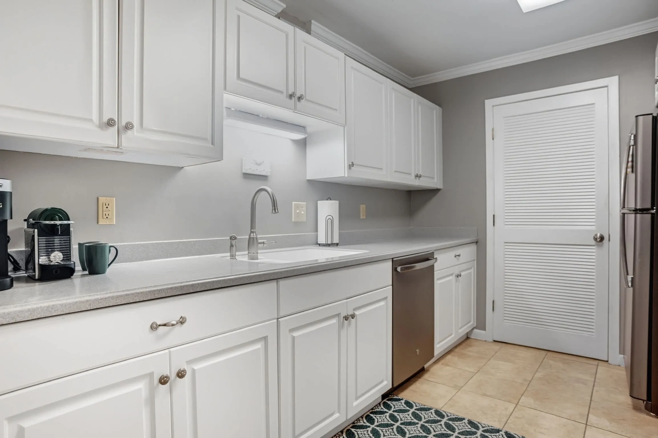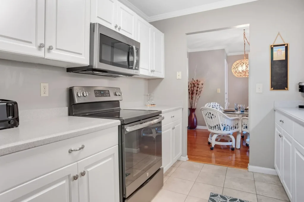 The full kitchen is equipped with a stove, oven, microwave, dishwasher, and a Keurig coffee maker with coffee pods available for guest use. A washer and dryer are conveniently located inside the unit.