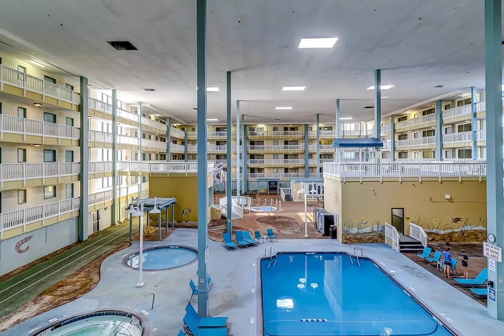 Top-floor condo with pools, hot tub, fitness room, central AC – 1 block to beach