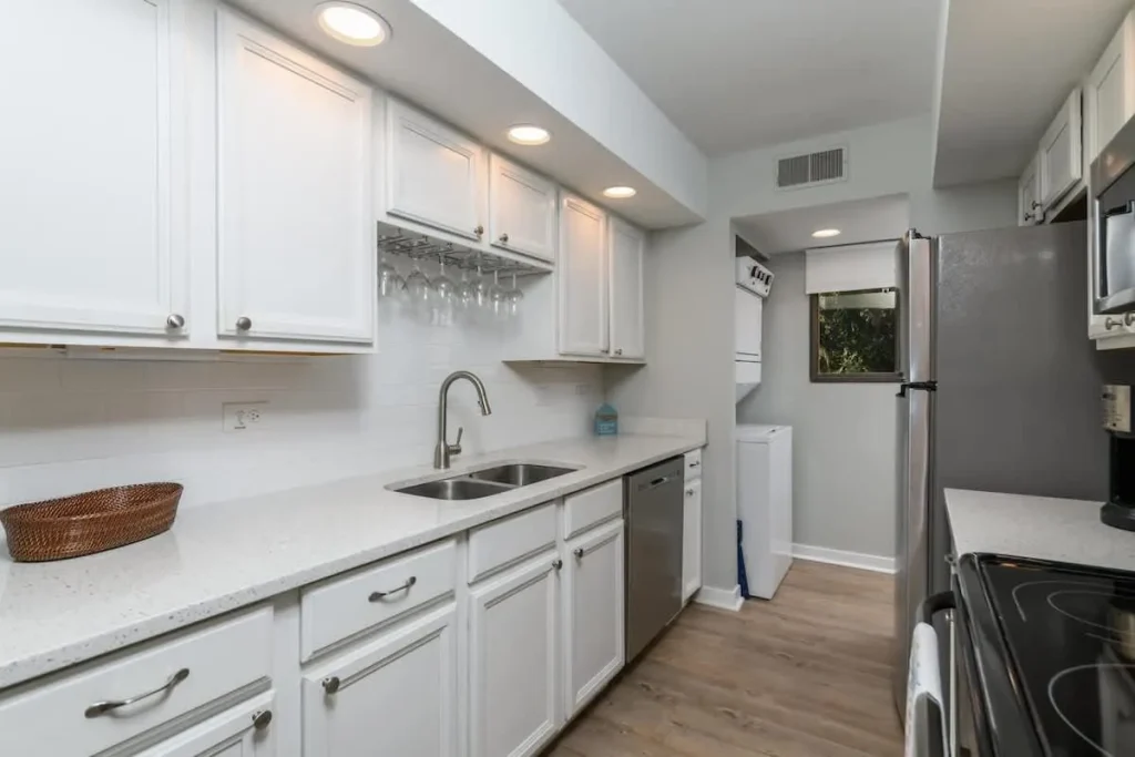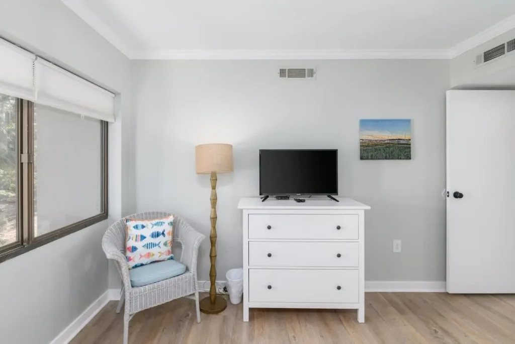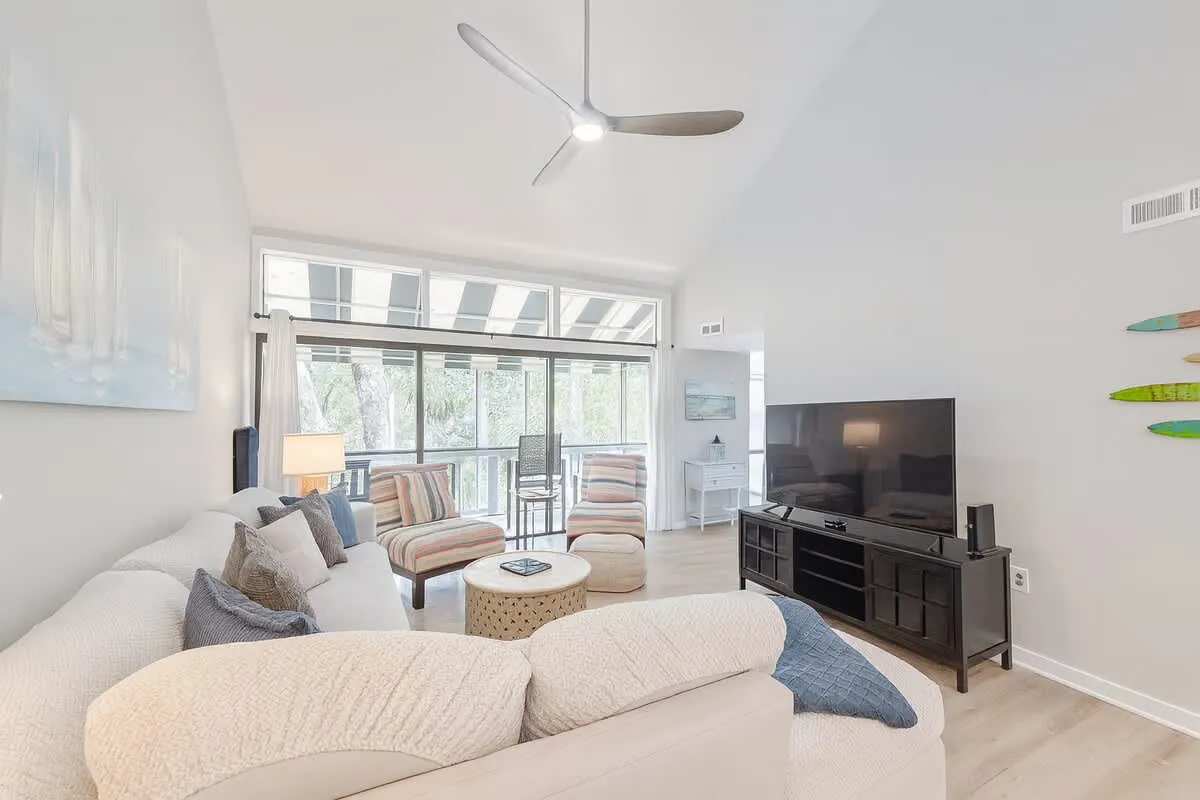Updated 2BR/2.5BA Treetops Villa near Coligny! Features vaulted ceilings, renovated kitchen, coastal LVP flooring, king and queen beds, private balcony, and in-unit laundry. Enjoy 3 pools, tennis courts, and easy beach access. Walk or bike to Coligny Plaza’s shops and restaurants. Beach gear provided for your convenience!