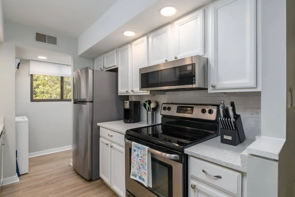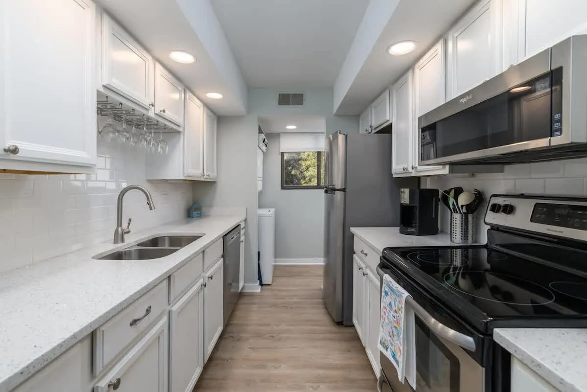 *RENOVATED KITCHEN featuring white cabinets, stainless steel appliances, and quartz countertops