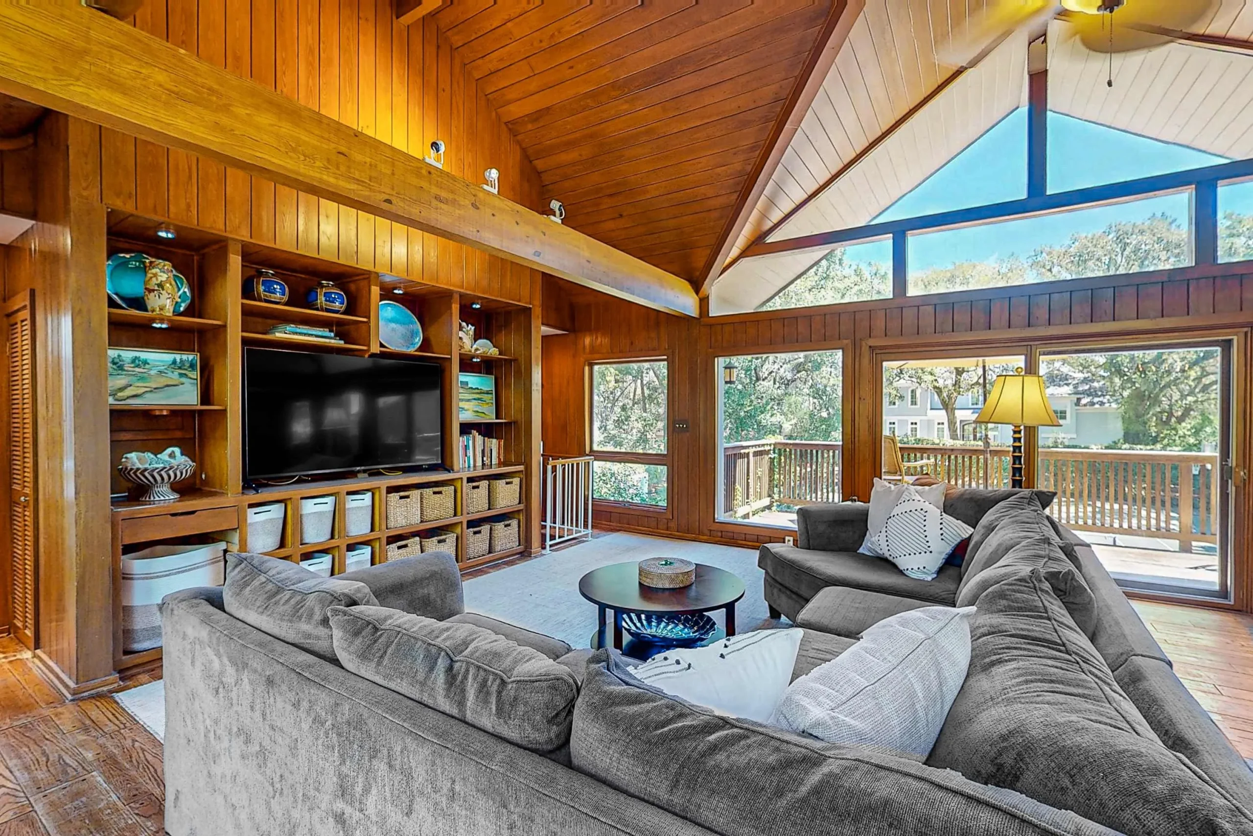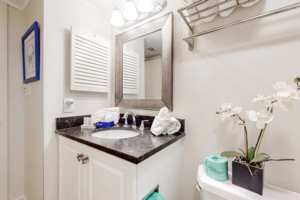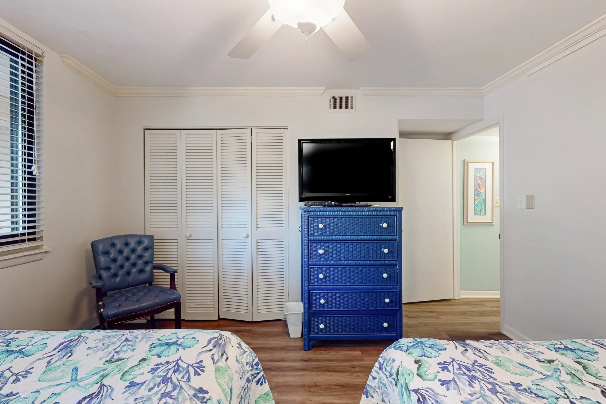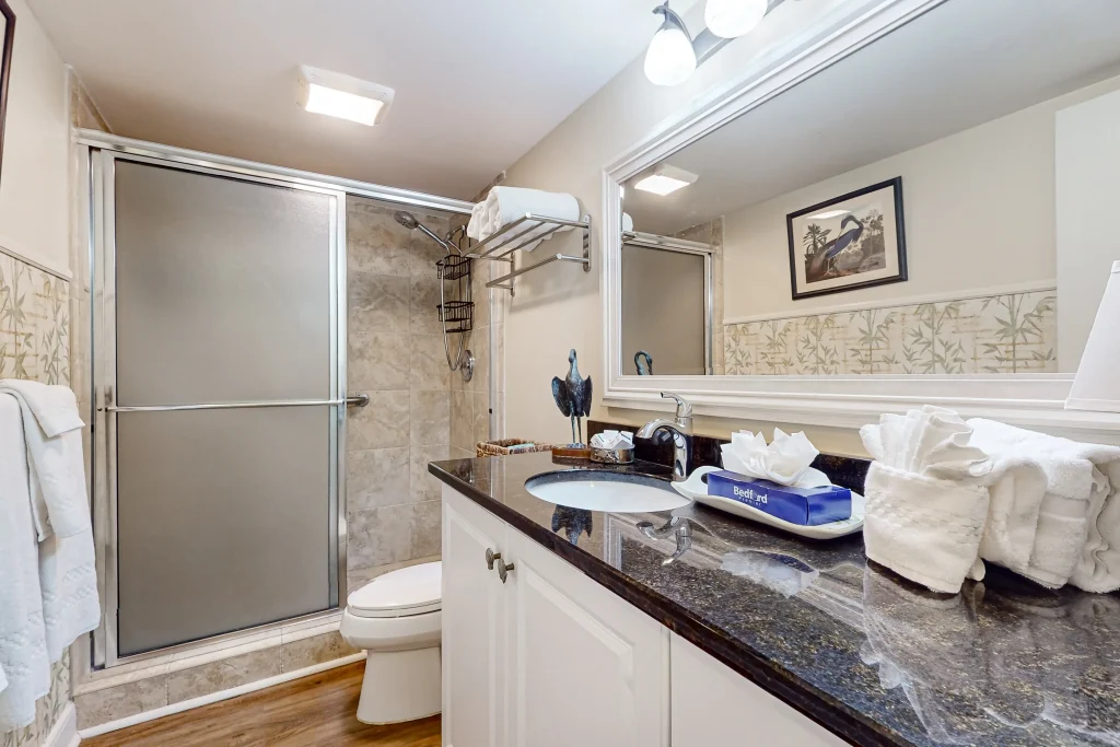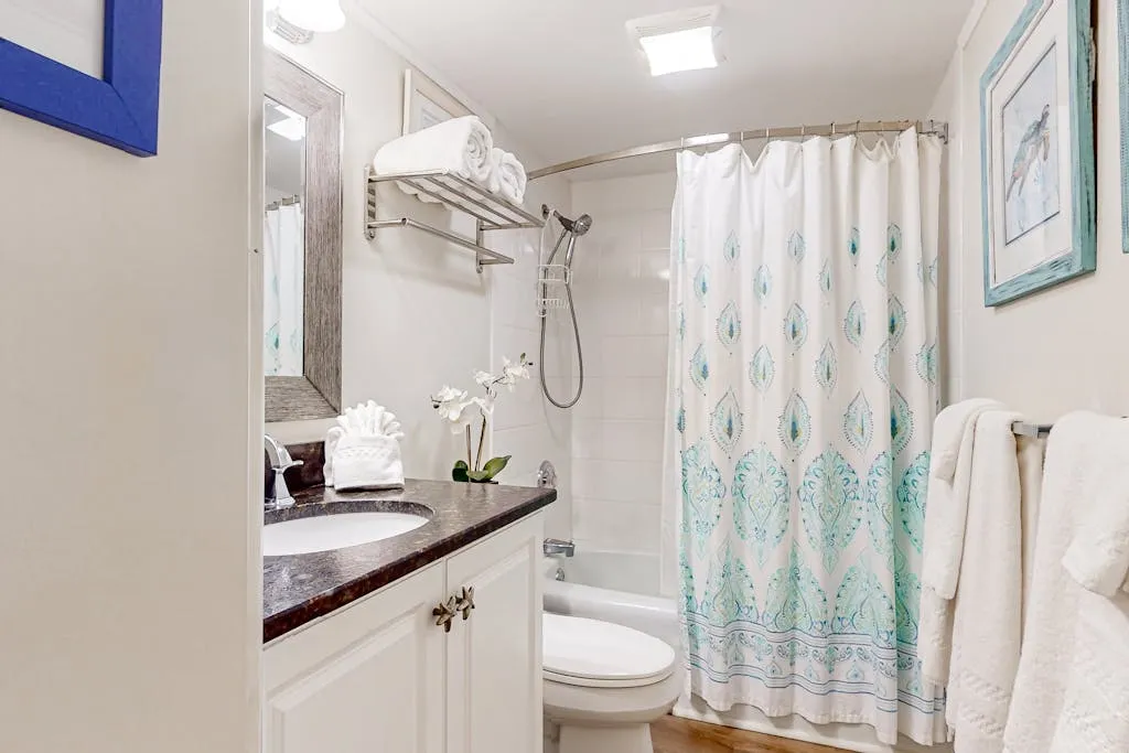 The spacious primary bedroom has a king bed, deck access, and 30′ flatscreen TV. The private bathroom features a walk-in shower. The guest bedroom has two double beds and access to the hallway bathroom so you can be sure to have room for all of your loved ones.